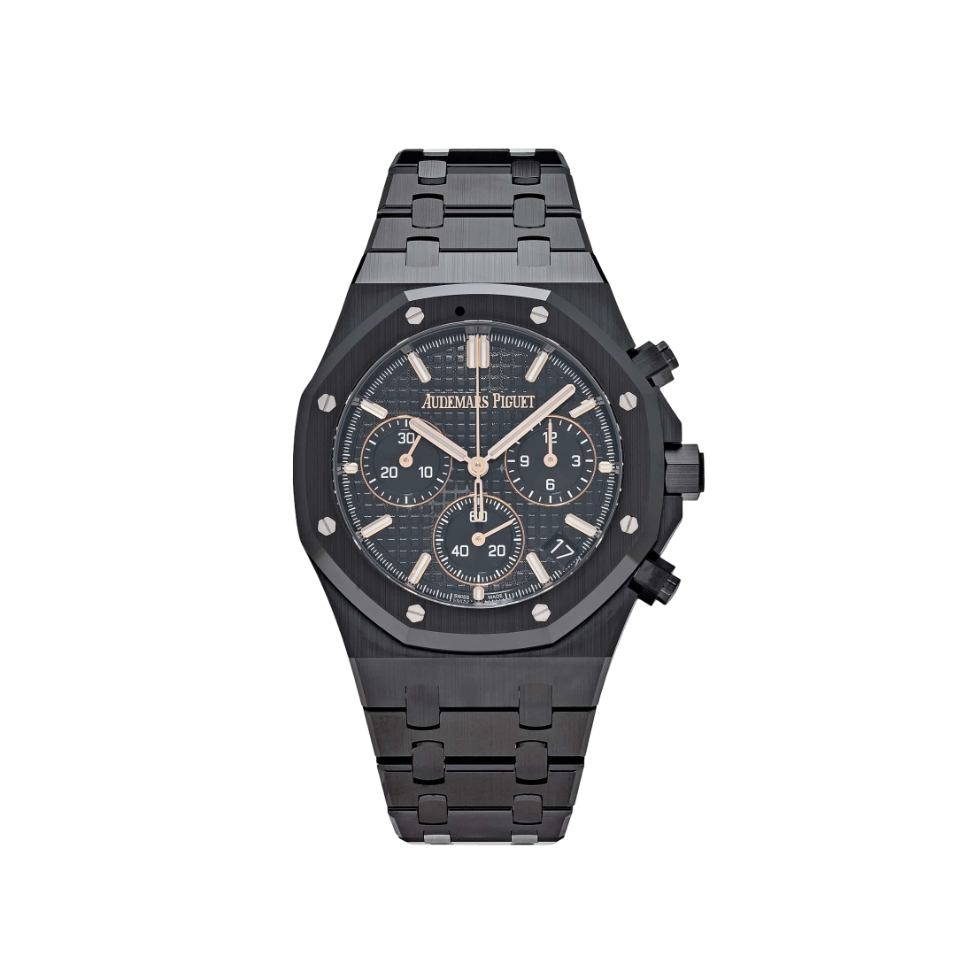 يُعَدّ إصدار رويال أوك كرونوغراف أوتوماتيكي 26240CE.OO.1225CE.02 تجسيداً جريئاً ومعاصراً لأيقونة أوديمار بيجيه، حيث صُنع بالكامل من السيراميك الأسود ليمنحه حضوراً قوياً وراقياً. تأتي العلبة المدمجة مع السوار بقطر 41 مم، وتبرز من خلال اللمسات النهائية المصقولة والمطروقة التي تميز أسلوب الدار.