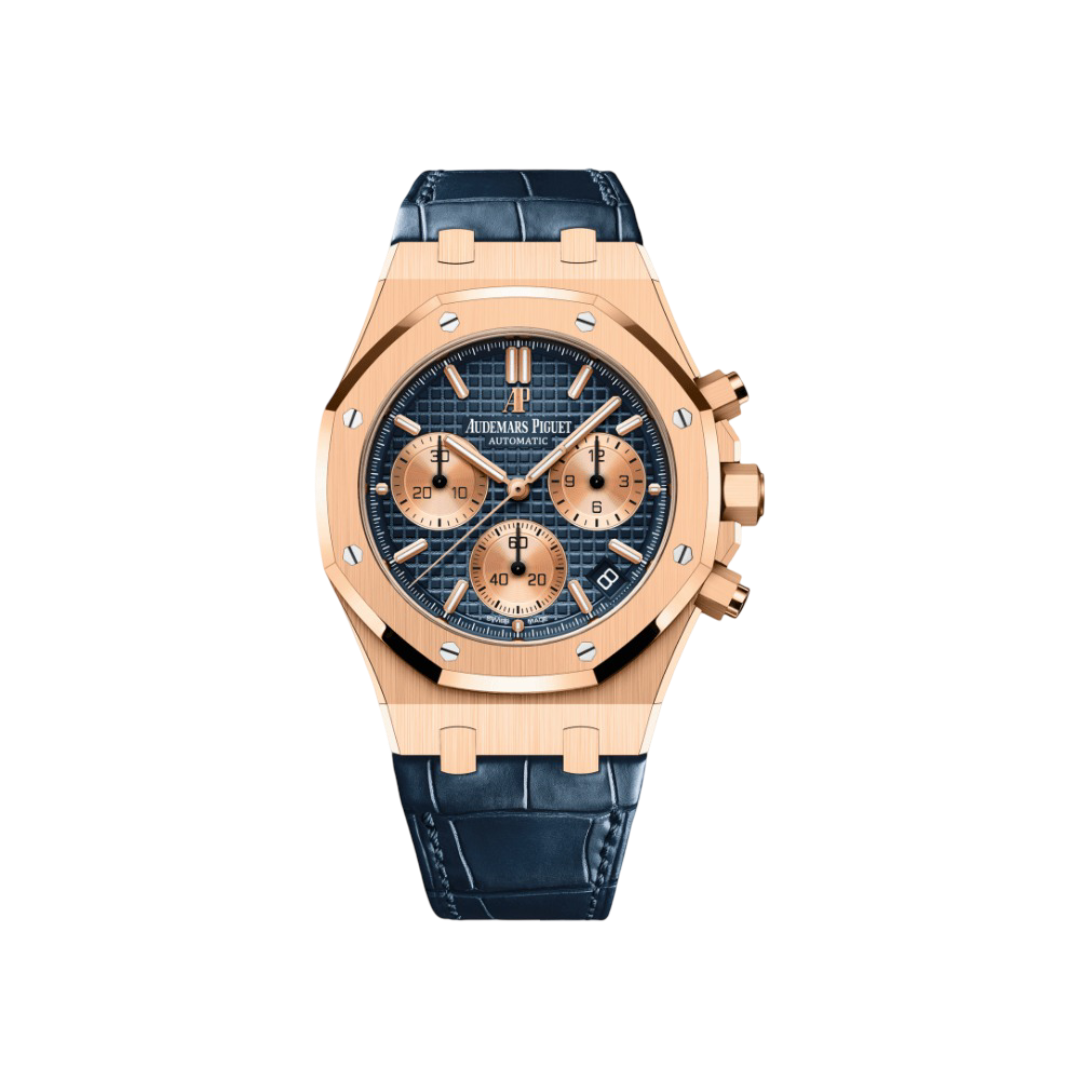 يجمع إصدار رويال أوك كرونوغراف أوتوماتيكي 26239OR.OO.D315CR.01 بين الأناقة الكلاسيكية والحرفية العصرية. تتميز العلبة المصنوعة بقياس 41 مم بميناء أزرق مزخرف بنقشة Grande Tapisserie، تتخلله عدادات بلون الذهب الوردي، ومؤشرات ساعات وعقارب مطلية بالذهب الوردي مع طبقة مضيئة لضمان وضوح مثالي.