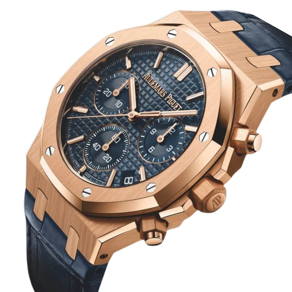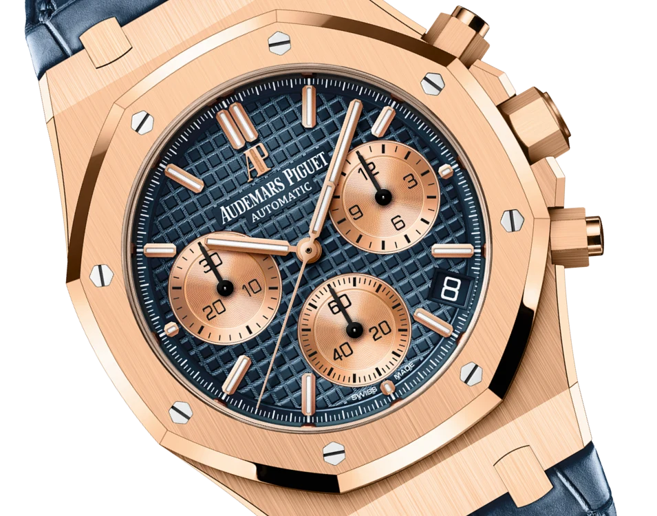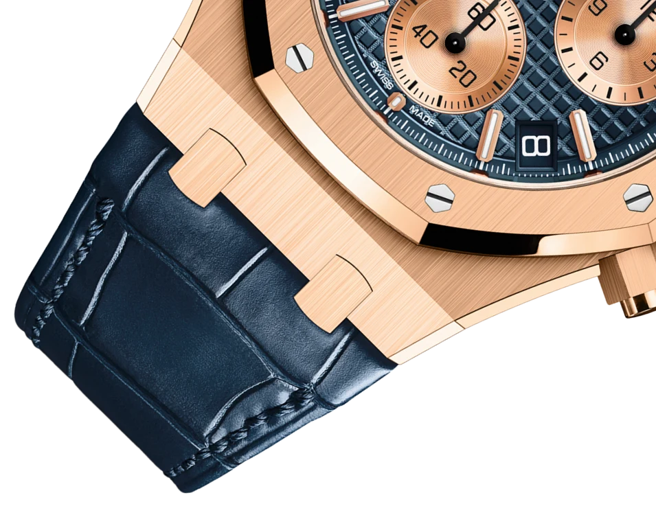 ويحمي الكريستال الصفيري المقاوم للانعكاس من الجهتين الميناء بدقة، بينما يكشف الغطاء الخلفي الشفاف عن أدق التفاصيل. كما تضيف التاج المثبت بالبراغي صلابة وظيفية عالية. يكتمل التصميم بسوار من جلد التمساح الأزرق المخيط يدوياً بمربعات كبيرة، مع مشبك قابل للطي من الذهب الوردي يحمل توقيع AP. ساعة كرونوغراف متقنة تعكس إرث رويال أوك الخالد.