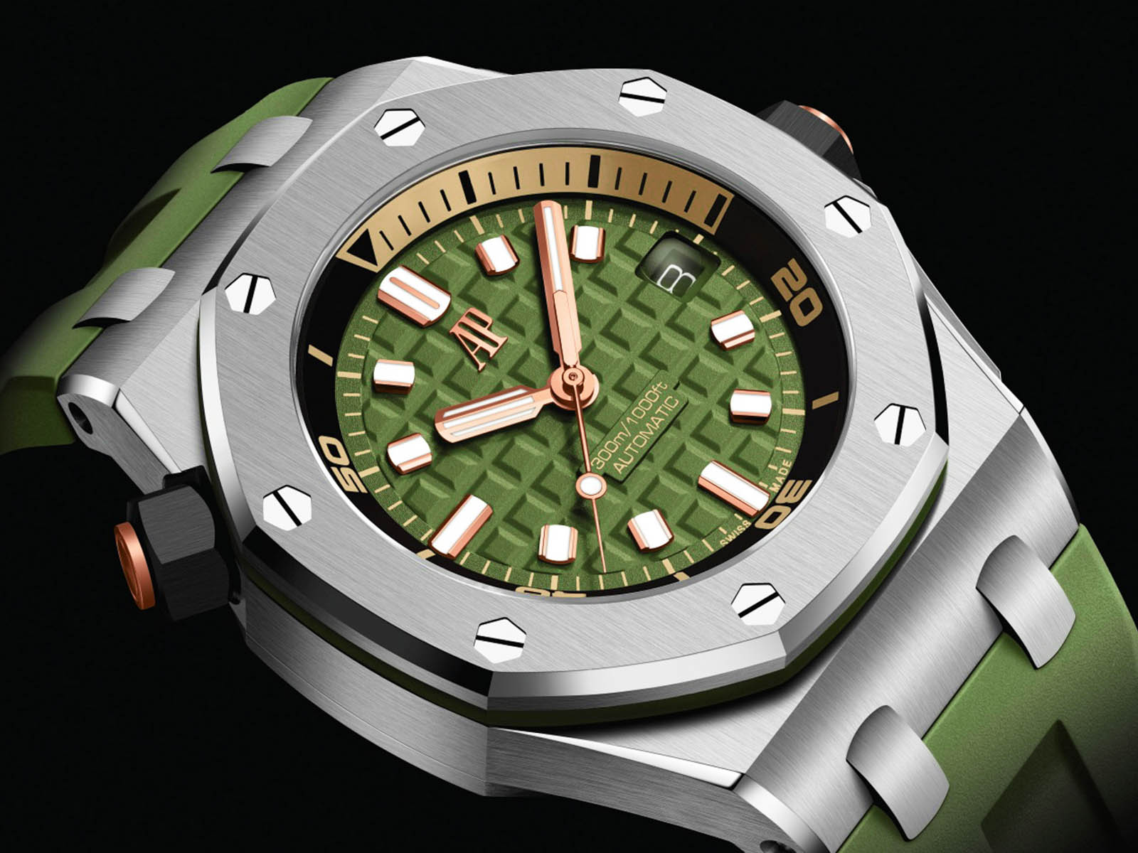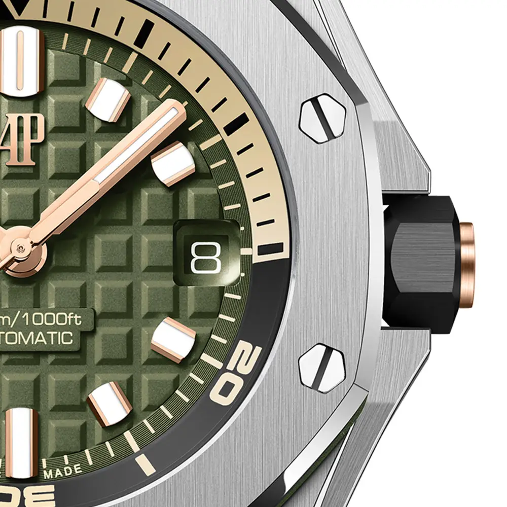 يزدان الميناء الأخضر الكاكي بنقشة Méga Tapisserie المميزة، مع مؤشرات ساعات من الذهب الأبيض وعقارب مطلية بمادة مضيئة لضمان وضوح مثالي في جميع الظروف. كما يتيح الإطار الداخلي الدوّار، الذي يتم التحكم به عبر التاج عند موضع الساعة العاشرة، دقة في تتبع أوقات الغوص، في حين يضيف منفذ التاريخ عند موضع الساعة الثالثة جانباً عملياً للاستخدام اليومي.
