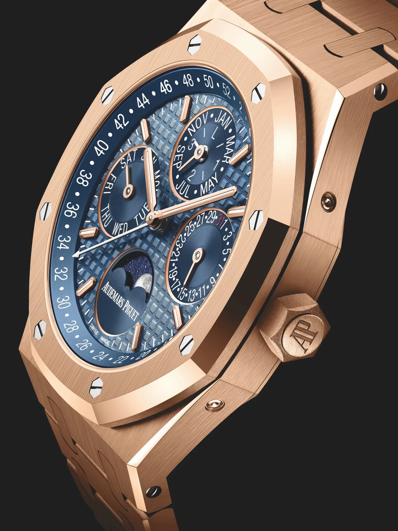 استمتع بالفخامة مع ساعة أوديمار بيجيه رويال أوك تقويم دائم. هذه الساعة بقطر 41 مم تتميز بحلقة ثمانية الأضلاع الأيقونية وأساور مدمجة. القرص الأزرق العميق بنمط "غراند تابريسيري" يحمل عدادات فرعية معقدة لليوم والتاريخ والشهر والسنة الكبيسة ومراحل القمر. أناقة خالدة وصناعة راقية.