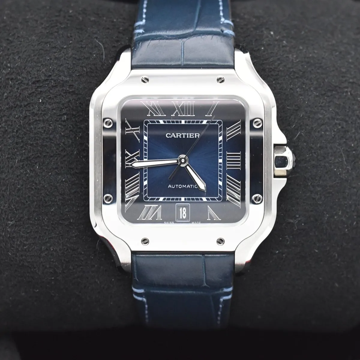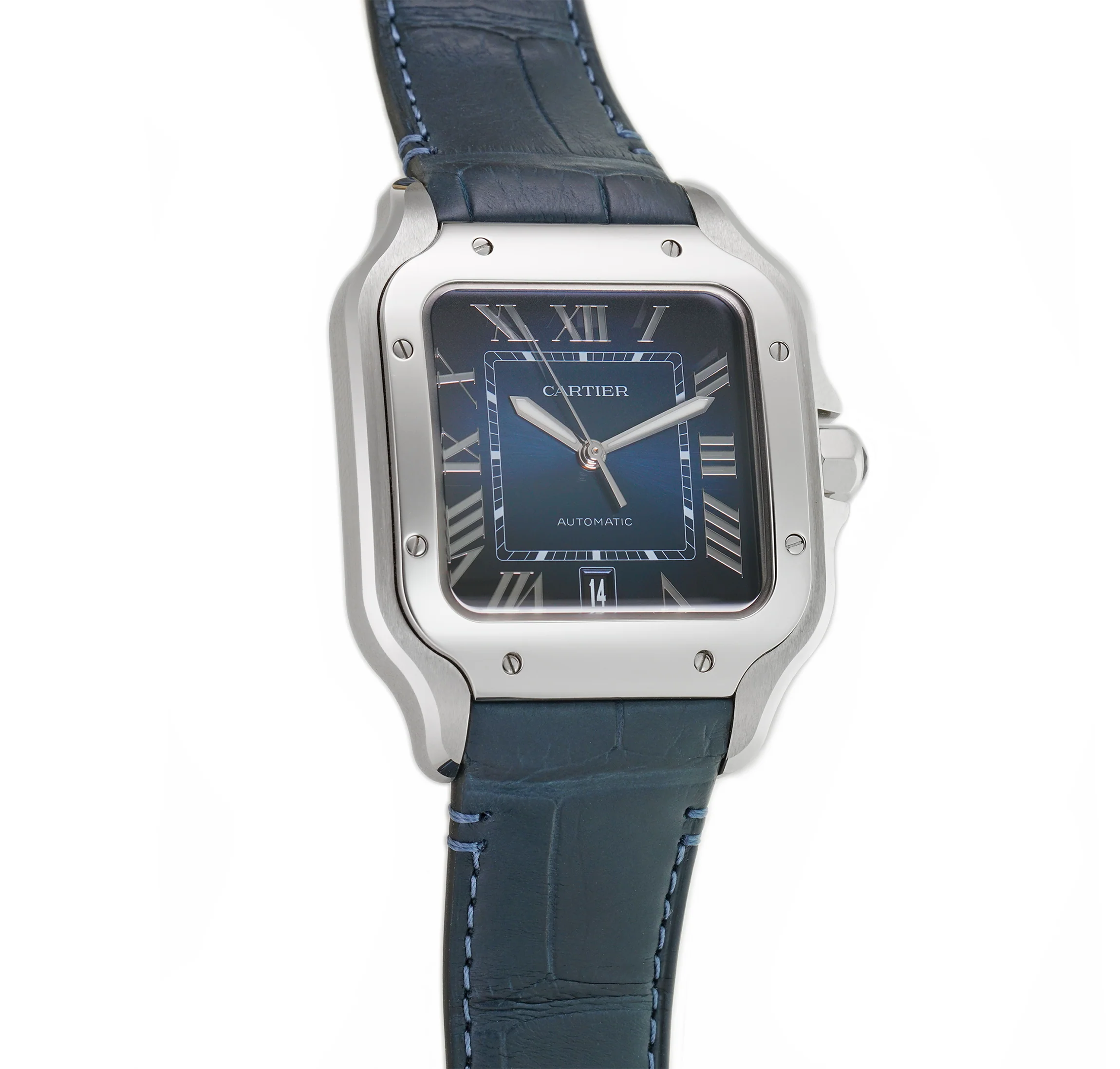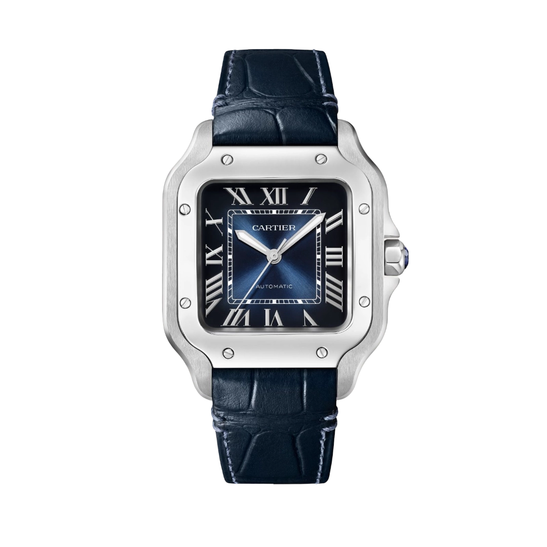 تجمع ساعة كارتييه سانتوس دو كارتييه كبير إصدار السوار الجلدي WSSA0071 بين العلبة المربعة الأيقونية المصنوعة من الفولاذ المقاوم للصدأ بقياس 39.8 مم والميناء الأزرق المتدرج بتأثير الشمس. تضفي الأرقام الرومانية المصقولة والعقارب المصممة على شكل سيوف ونافذة التاريخ عند الساعة السادسة توازناً وأناقة استثنائية. تعمل بحركة أوتوماتيكية وتأتي مع سوار فاخر من جلد التمساح الأزرق يجمع بين الفخامة والراحة والأسلوب العصري.