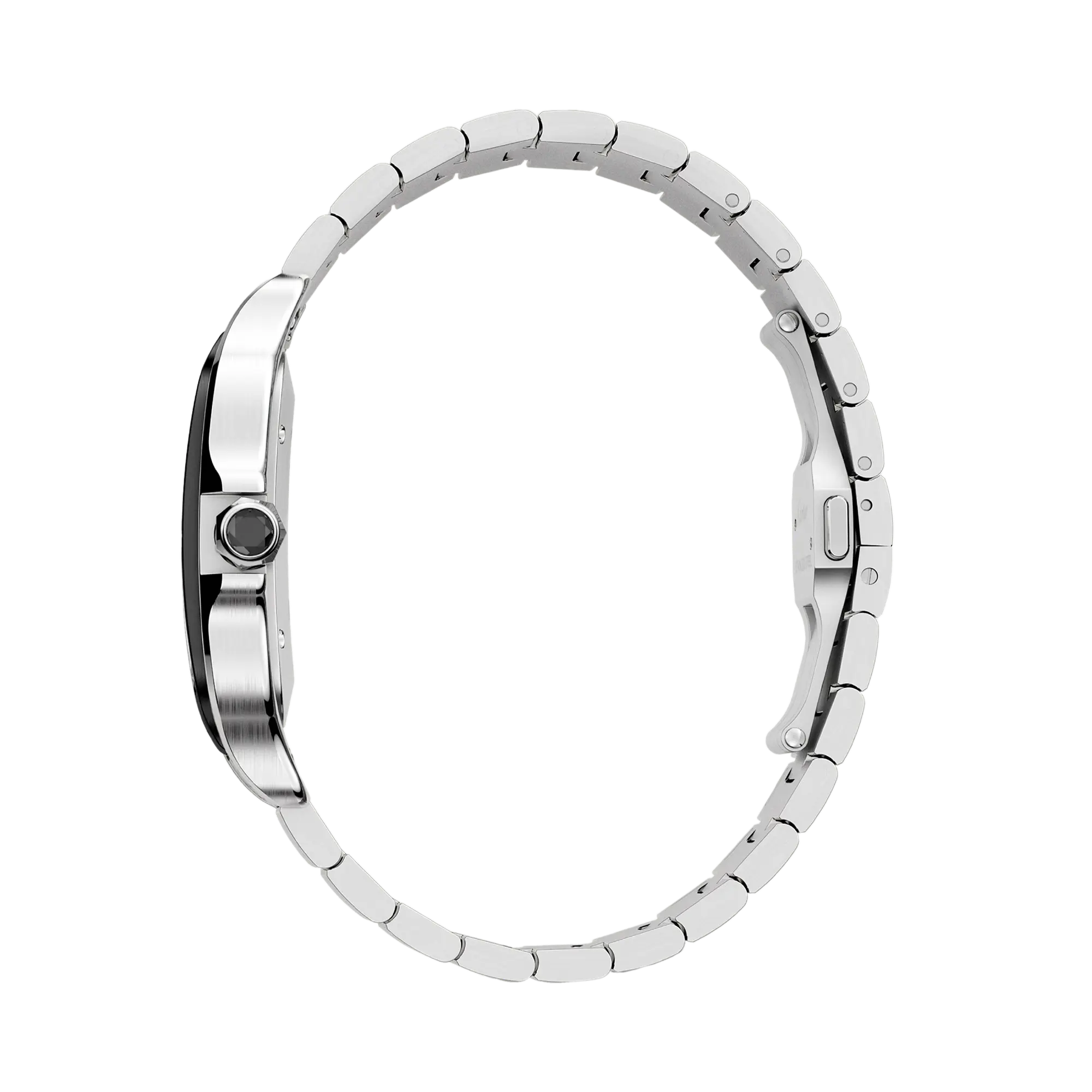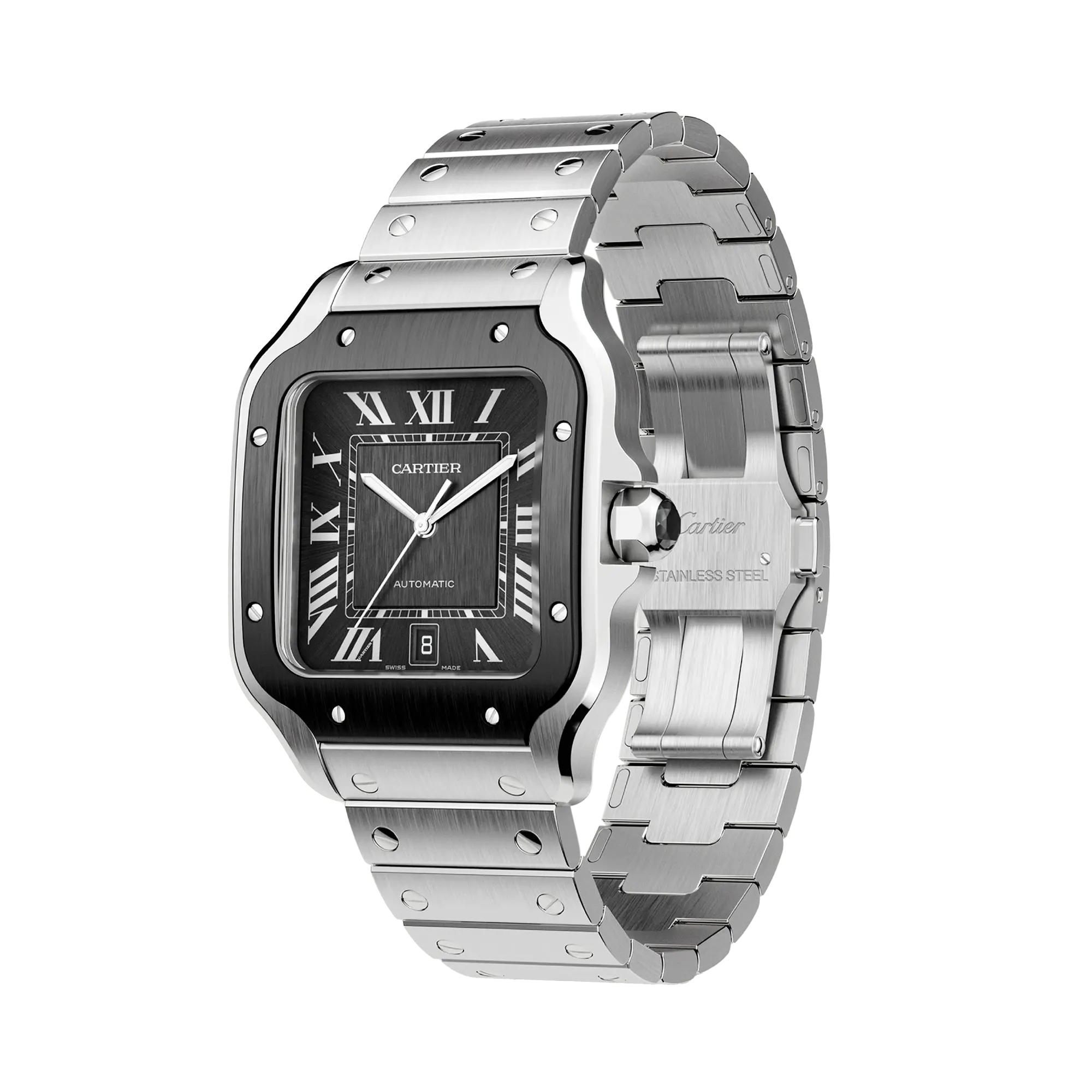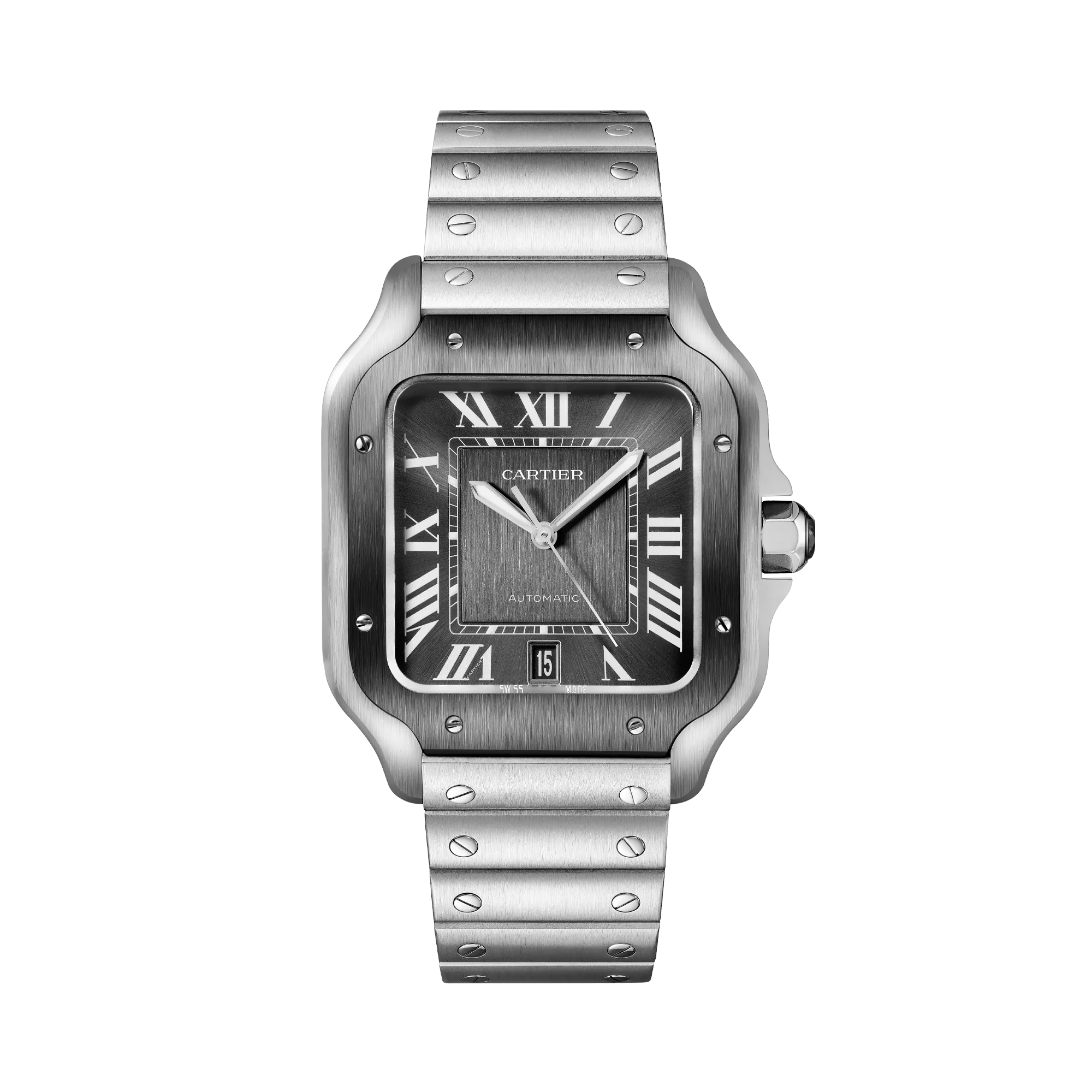 تقدم ساعة كارتييه سانتوس دو كارتييه كبير WSSA0037 تصميماً جريئاً وأنيقاً لإرث سانتوس الكلاسيكي. تأتي بعلبة فولاذية قياس 39.8 مم مع إطار مطلي باللون الأسود بتقنية ADLC يمنحها تبايناً ملفتاً. يتميز الميناء الرمادي بنقش أشعة الشمس وأرقام رومانية بيضاء وعقارب مضيئة على شكل سيوف مع نافذة تاريخ عند الساعة السادسة. تعمل بحركة أوتوماتيكية من كارتييه لتجمع بين الدقة والأناقة والعملية في تصميم عصري متقن.