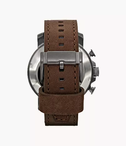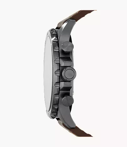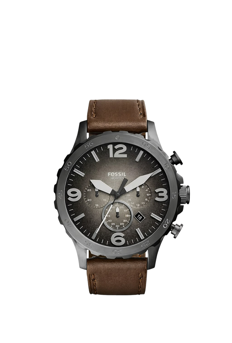 فوسيل نيت JR1424 ساعة كرونوغراف قوية وذكورية للرجال تفيض بالثقة العادية. تأتي بعلبة دائرية من الفولاذ المقاوم للصدأ مع إطار ثابت مطلي أيوني رمادي دخاني وتاج لولبي، ميناؤها الرمادي مزين بعقارب وعلامات مؤشر مضيئة وأرقام عربية عند ٣ و٦ و٩ و١٢ وعلامات دقائق حول الحافة الخارجية وثلاث موانئ فرعية لـ٦٠ ثانية و٣٠ دقيقة و٢٤ ساعة. نافذة تاريخ عند ٤ تضيف عملية. سوار جلد العجل البني مع إبزيم شوكة يوفر راحة في الارتداء. محمي بزجاج معدني مقاوم للخدش وتعمل بحركة كوارتز دقيقة، توفر مقاومة للماء حتى ٥٠ مترًا. مثالية للمغامرات اليومية، تجمع هذه الساعة التناظرية الكرونوغراف بين أسلوب فوسيل القوي المميز والموثوقية الوظيفية والجاذبية الخالدة للرجل العصري.