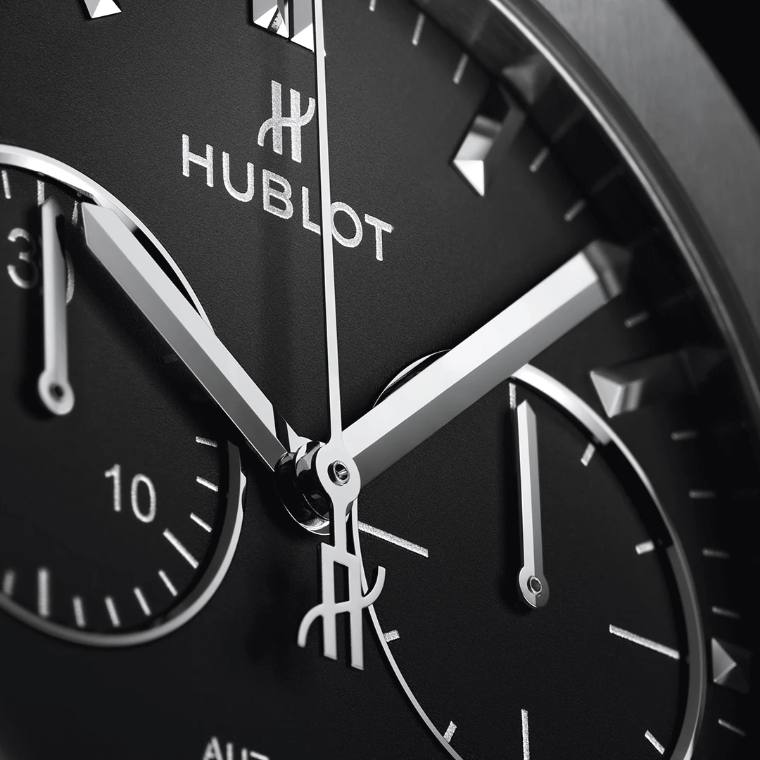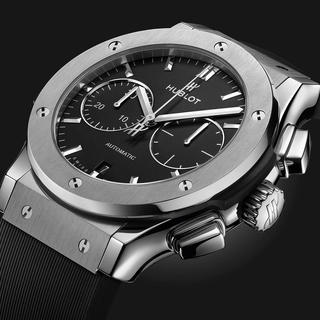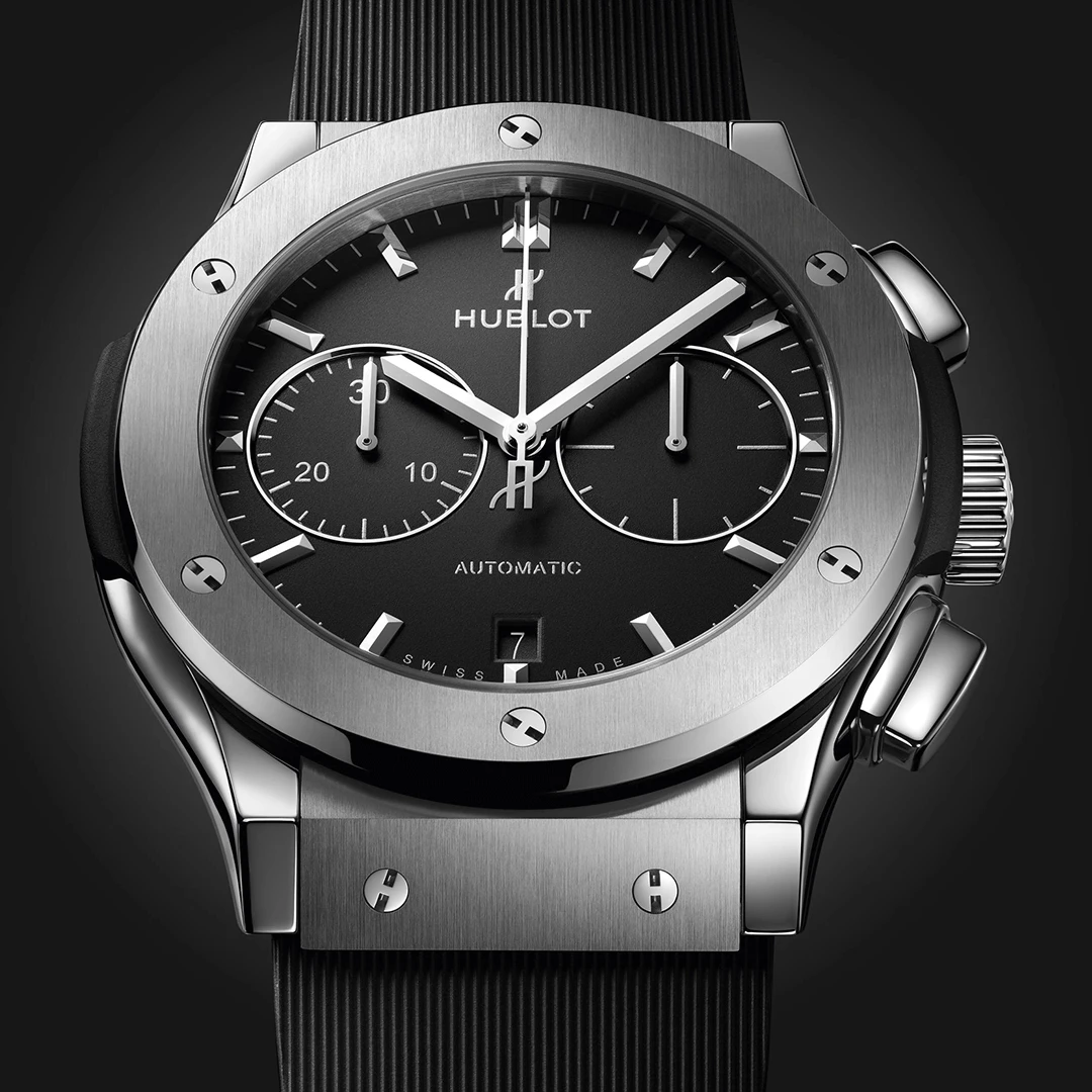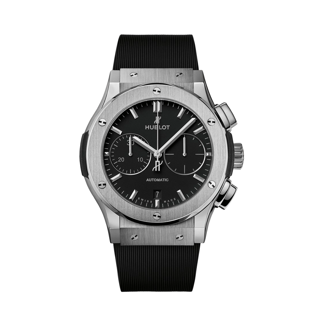 تجمع ساعة هوبلو كلاسيك فيوجن كرونوغراف تيتانيوم ٤٥ ملم 521.NX.1171.RX بين القوة والخفة والأناقة الحديثة. صُنعت من التيتانيوم المصقول والمُعالج بخطوط ساتان من الدرجة الخامسة، وتتميز بميناء أسود مطفي وكريستال ياقوتي مقاوم للانعكاس. تعمل بحركة كرونوغراف أوتوماتيكية وتأتي بسوار مطاطي أسود مبطّن، مجسدةً فلسفة هوبلو في "فن الانصهار".