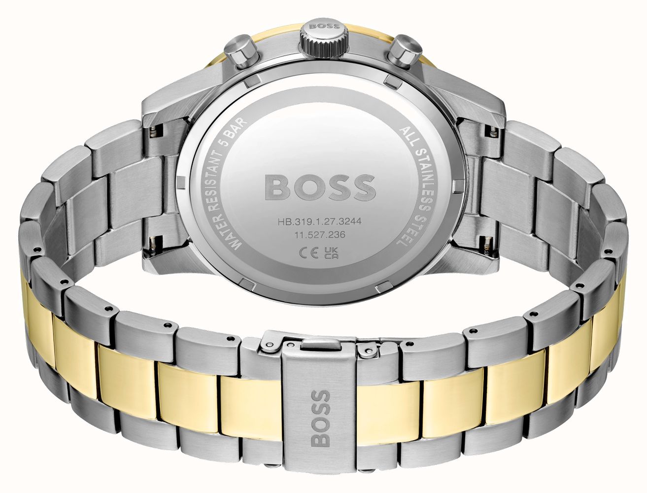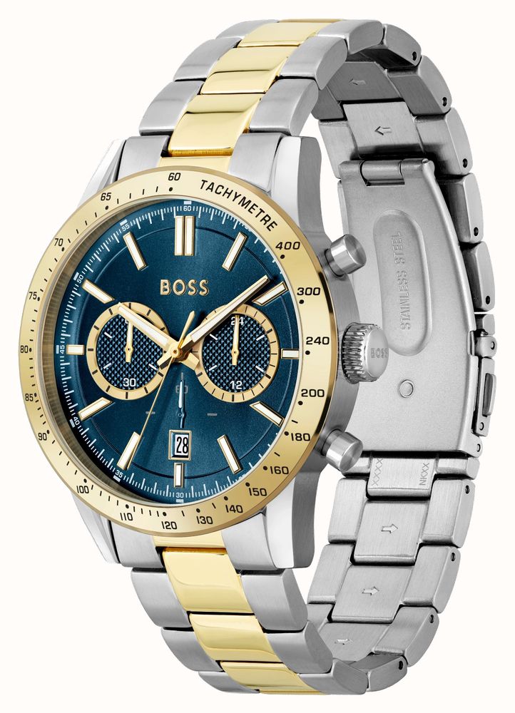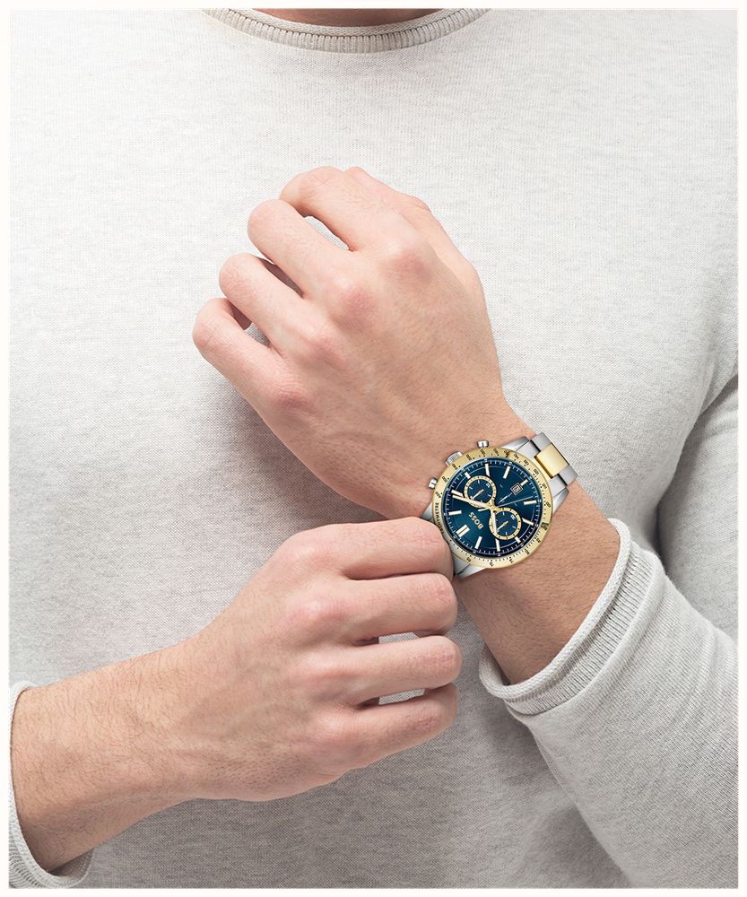 هوغو بوس ألور كرونوغراف 1514163 ساعة راقية للرجال تجمع بين وظائف الكرونوغراف الرياضية والأناقة ثنائية اللون الفاخرة. تأتي بعلبة دائرية قوية من الفولاذ المقاوم للصدأ قطرها ٤٤ ملم، مع ميناء أزرق آسر مزين بعلامات ساعات باتون وعقارب مضيئة لقراءة فائقة، وموانئ كرونوغراف وعرض تاريخ عملي. سوار الفولاذ ثنائي اللون فضي وذهبي يضيف تباينًا فاخرًا ومتعدد الاستخدامات لانتقالات أسلوب سلسة. تعمل بحركة كوارتز ببطارية دقيقة توفر توقيتًا موثوقًا ومقاومة للماء حتى ٥٠ مترًا. مصممة بأسلوب هوغو بوس العصري المميز، تفيض هذه الساعة التناظرية بالثقة والرقي، مما يجعلها خيارًا مثاليًا للرجل المعاصر الذي يقدر وظائف الكرونوغراف والحرفية المتينة والفخامة الهادئة الجريئة في قطعة يومية أساسية.