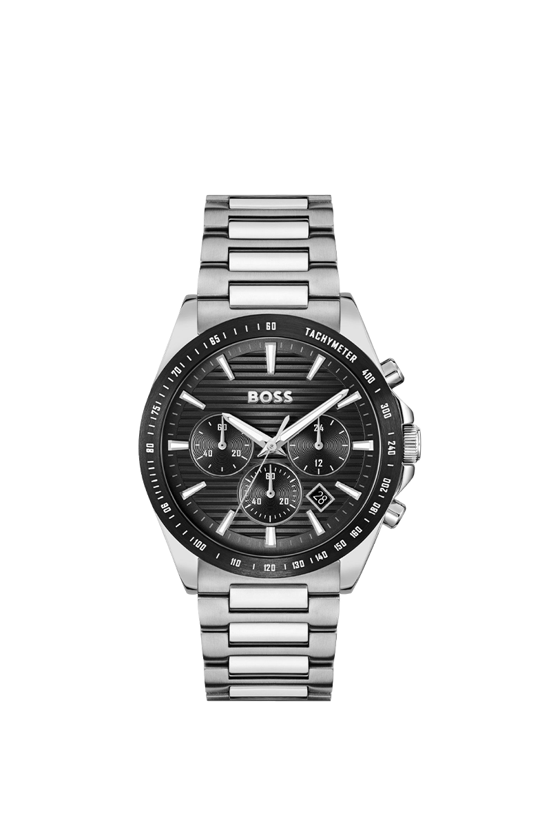هوغو بوس سترايك كرونو 1514290 ساعة كرونوغراف أنيقة للرجال من مجموعة خريف/شتاء ٢٠٢٥، تجمع بين الوظائف الرياضية والأناقة الرفيعة. تأتي بعلبة دائرية مصقولة من الفولاذ المقاوم للصدأ قطرها ٤١ ملم وسمكها النحيف 10 ملم، مع ميناء أسود مزين بعقارب فضية لتباين حاد وقراءة ممتازة. الإطار الثابت التاكيميتر من الفولاذ يضيف لمسة سباق ديناميكية، مع تاج سحب وظهر علبة قابل للتركيب. محمي بزجاج معدني متين، يوفر مقاومة للماء ٥ بار، مناسبة للاستحمام. تعمل بحركة كوارتز دقيقة، تفيض هذه الساعة التناظرية بأسلوب هوغو بوس العصري المتقن، مما يجعلها خيارًا متعدد الاستخدامات للرجل المعاصر الذي يقدر وظائف الكرونوغراف والحرفية المتينة والأسلوب الهادئ في ساعة يومية خفيفة ومريحة.