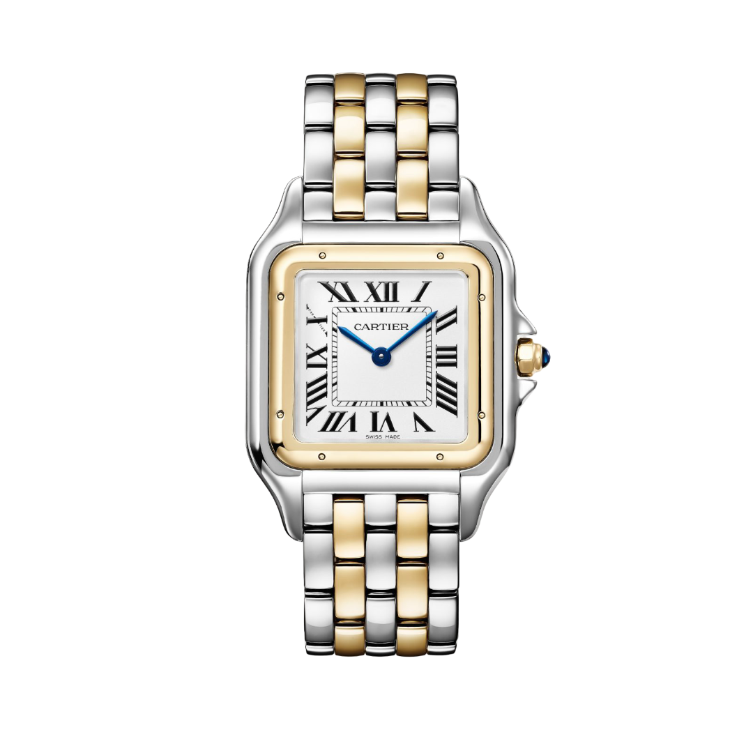 تجسد ساعة بانتير دو كارتييه الكبيرة بلونين من الذهب والفضة أناقة كارتييه الخالدة وحرفيتها الرفيعة. وتأتي بعلبة وسوار مقاس 30 × 40 مم بتصميم انسيابي لامع يعكس الفخامة. يتميز الميناء الفضي بعقارب زرقاء على شكل سيوف وأرقام رومانية تضيف لمسة كلاسيكية راقية. تعمل بحركة كوارتز دقيقة ومحمية بزجاج كريستال الياقوت، لتجمع بين الأناقة والعملية في قطعة فاخرة واحدة.