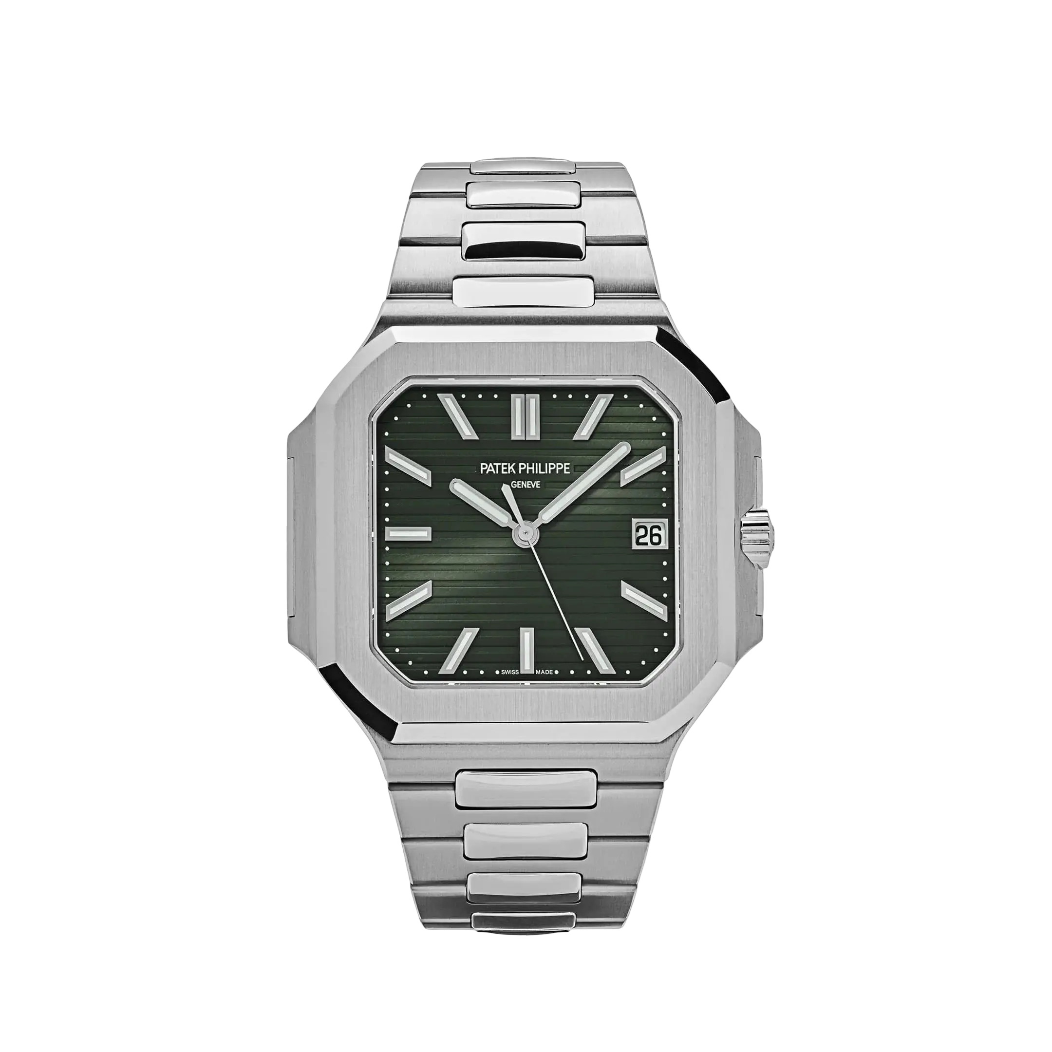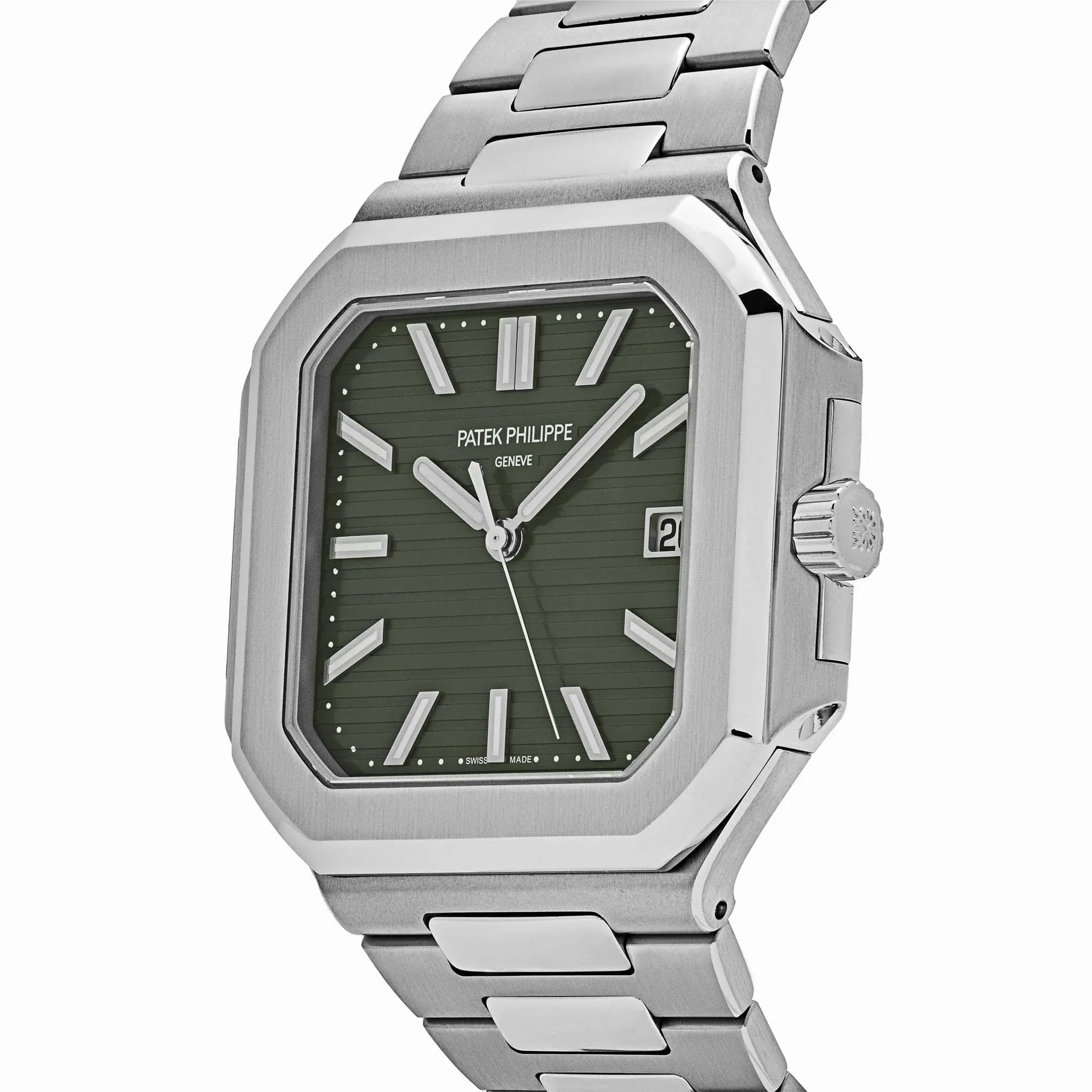 تجسد ساعة باتيك فيليب كيوبتس 5821/1A-001 من الفولاذ المقاوم للصدأ مع ميناء أخضر نابض بالحياة مزيجاً رائعاً من الأناقة العصرية والدقة الفائقة. يبرز الميناء الأخضر بتشطيبه الشعاعي الجذاب على خلفية العلبة والسوار الفولاذيين، ليمنح الساعة طابعاً معاصراً مميزاً.