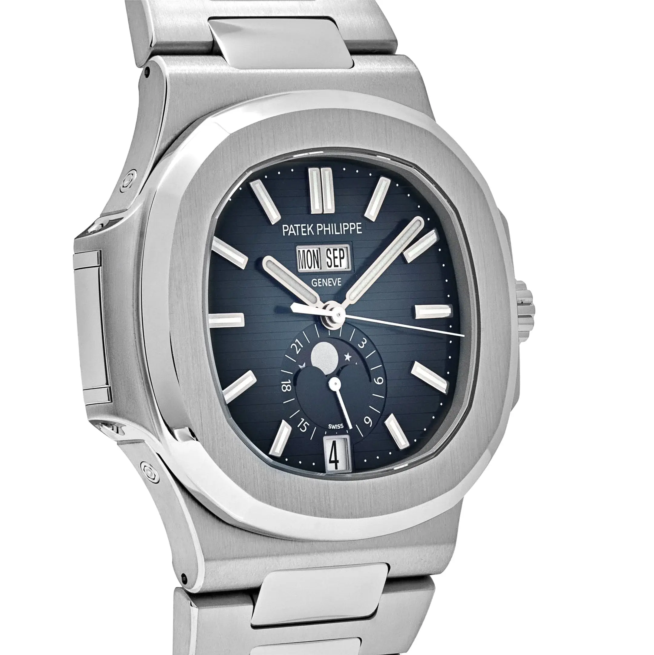 تجمع ساعة نوتيلس 5726/1A-014 بين الأناقة الرياضية لوضعية نوتيلس الشهيرة وبين العملية التي يقدمها التعقيد الوظيفي للتقويم السنوي. تأتي بعلبة من الفولاذ المقاوم للصدأ بحجم 40.5 مم، مع ميناء أزرق متدرج مزخرف بالنقش الأفقي المميز للمجموعة، ليضفي عمقاً وأناقة استثنائية.