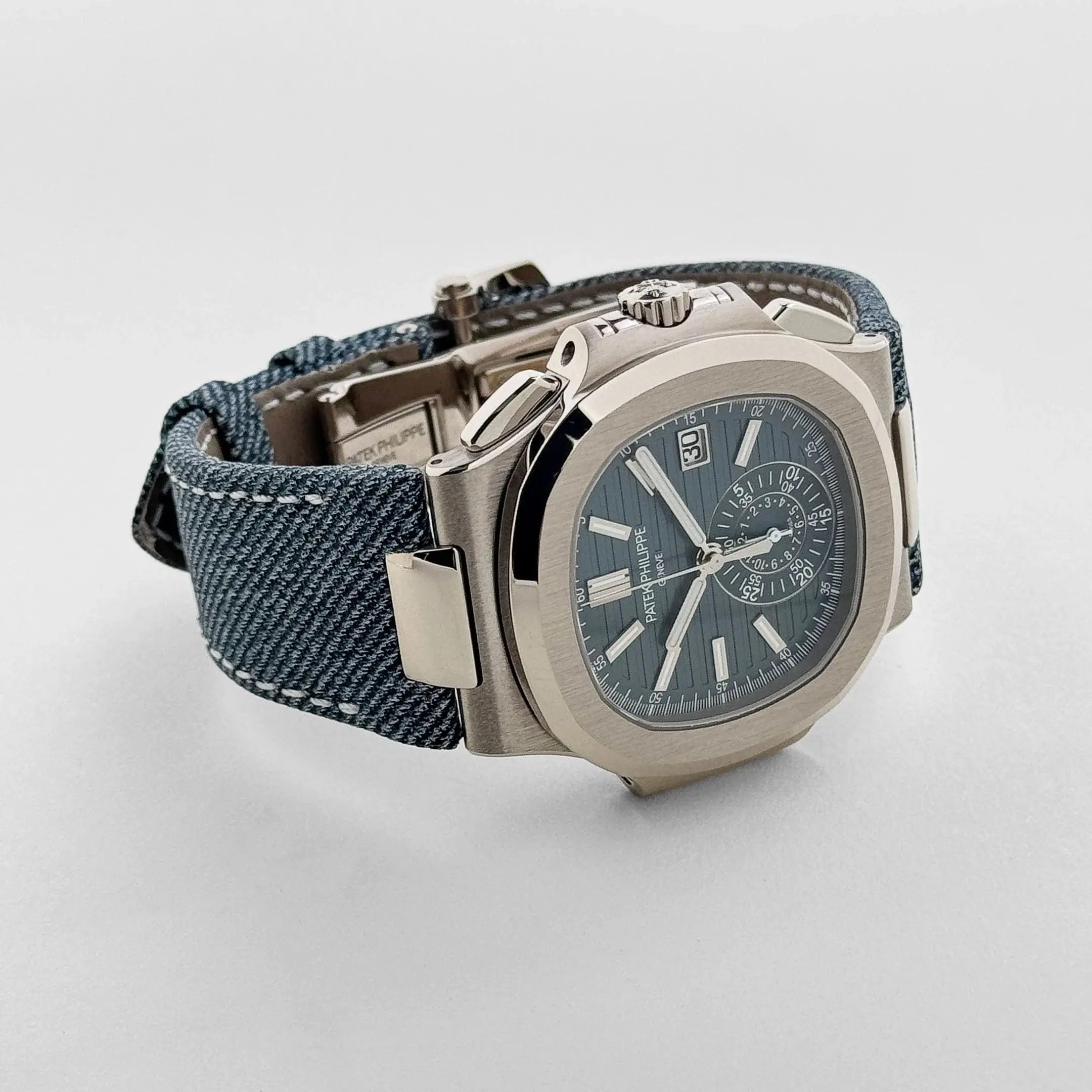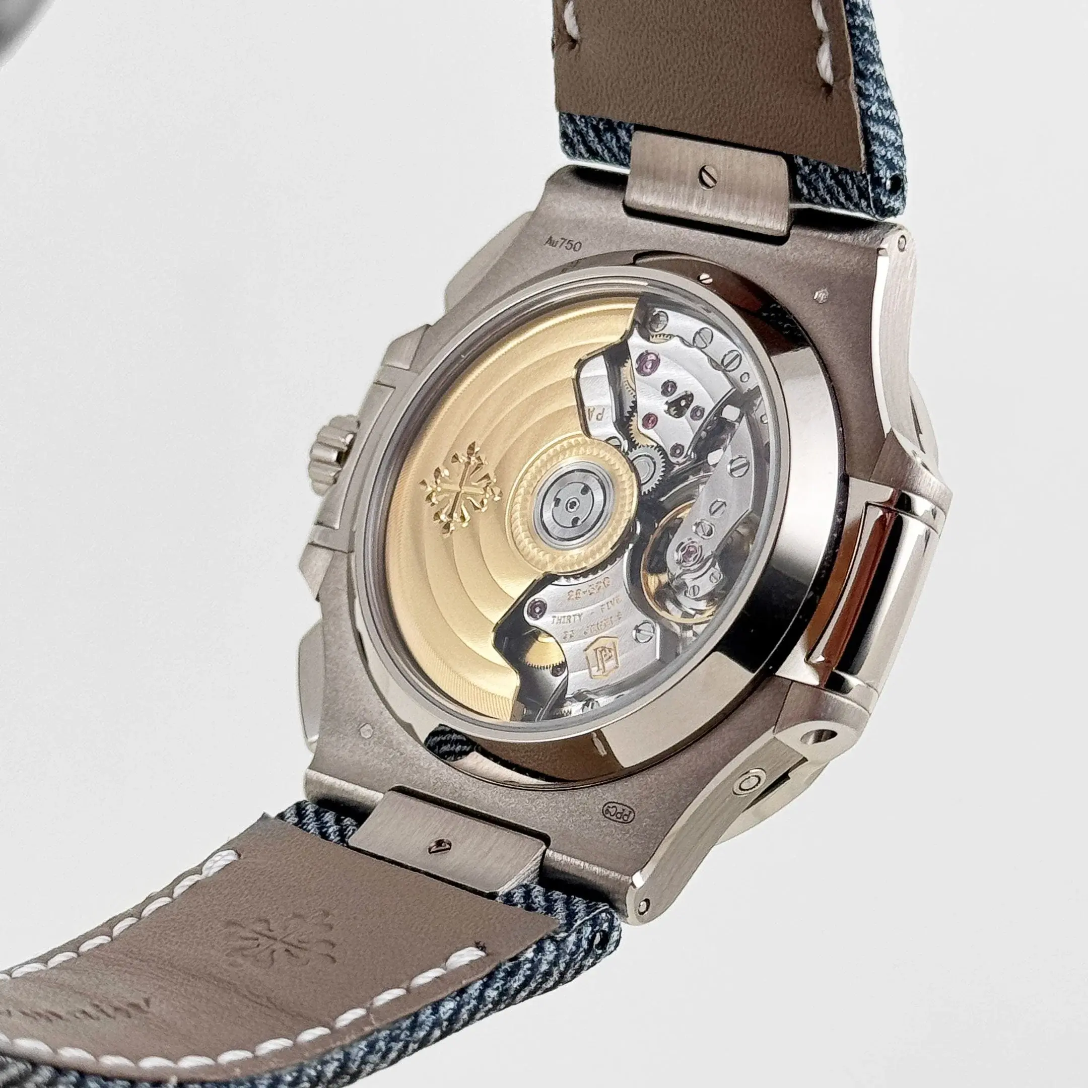 تجمع ساعة باتيك فيليب نوتيلوس 5980/60G-001 "دينم" فلايباك كرونوغراف بين الأناقة الرياضية والعملية الفائقة في تصميم واحد استثنائي. تأتي بعلبة بقياس 40.5 ملم، مزودة بسوار أزرق-رمادي مزخرف بنقشة تشبه قماش الدينم، مما يمنحها طابعًا عصريًا غير رسمي مع لمسة راقية.