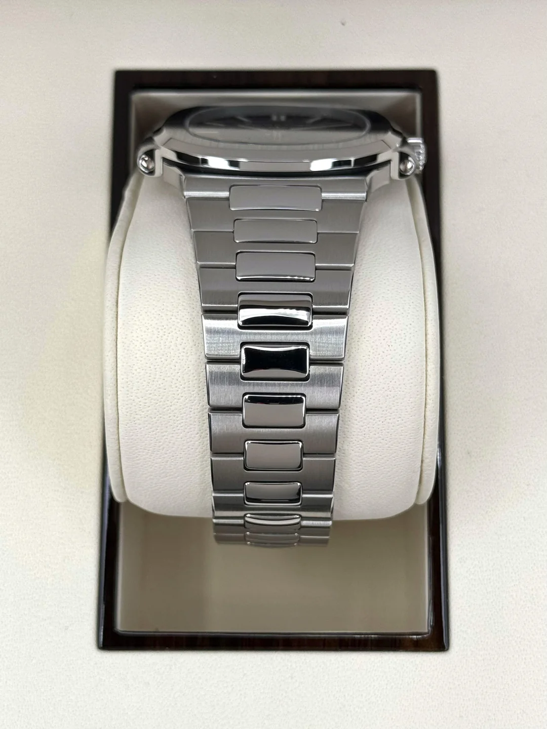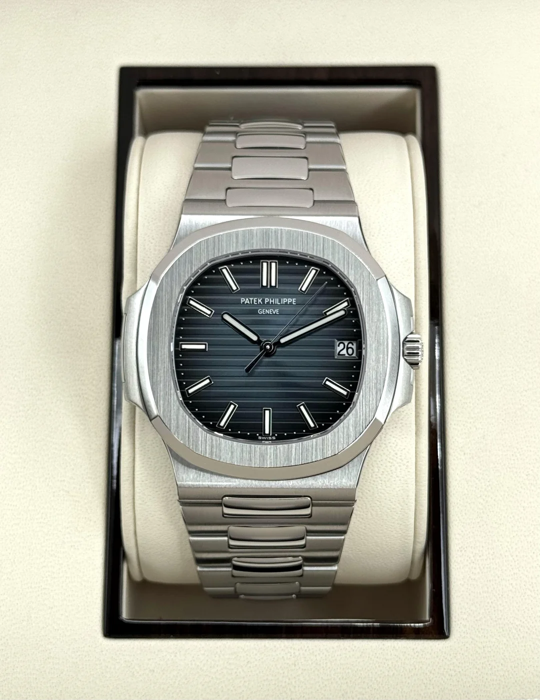 سوبر كلون باتيك فيليب نوتيلوس 5811/1G-001 نسخة ١:١ لا يُمكن تمييزها عن الأصلية أبدًا. العلبة ٤٠٫٥ ملم والسوار المتكامل بتشطيب يدوي ساتاني ولامع مثالي، نفس الوزن والملمس والحضور الفاخر للقطعة الاصلية. الميناء الأزرق الشمسي المتدرج بنقش أفقي دقيق يلعب مع الضوء بطريقة ساحرة، علامات وعقارب بارزة مع طلاء فسفوري قوي لقراءة واضحة في كل الظروف. نافذة التاريخ عند الثالثة متناغمة تمامًا. تعمل بحركة مكررة بالكامل (كاليبر 26-330 S C) بثواني انسيابية، تغيير تاريخ لحظي، واحتياطي طاقة ٤٥ ساعة. الظهر شفاف من الياقوت، كل النقوش والأرقام التسلسلية مطابقة ١٠٠٪. حتى أكبر الخبراء لن يلاحظوا أي فرق. هذه هي النوتيلوس الجديدة التي حلّت محل الـ5711 الأسطورية، تحفة عصرية تجمع الأناقة الهادئة مع الفخامة العالية، قطعة الأحلام التي ينتظرها الجميع في القوائم الرسمية لسنوات. جوهرة خالدة لكل جامع حقيقي.