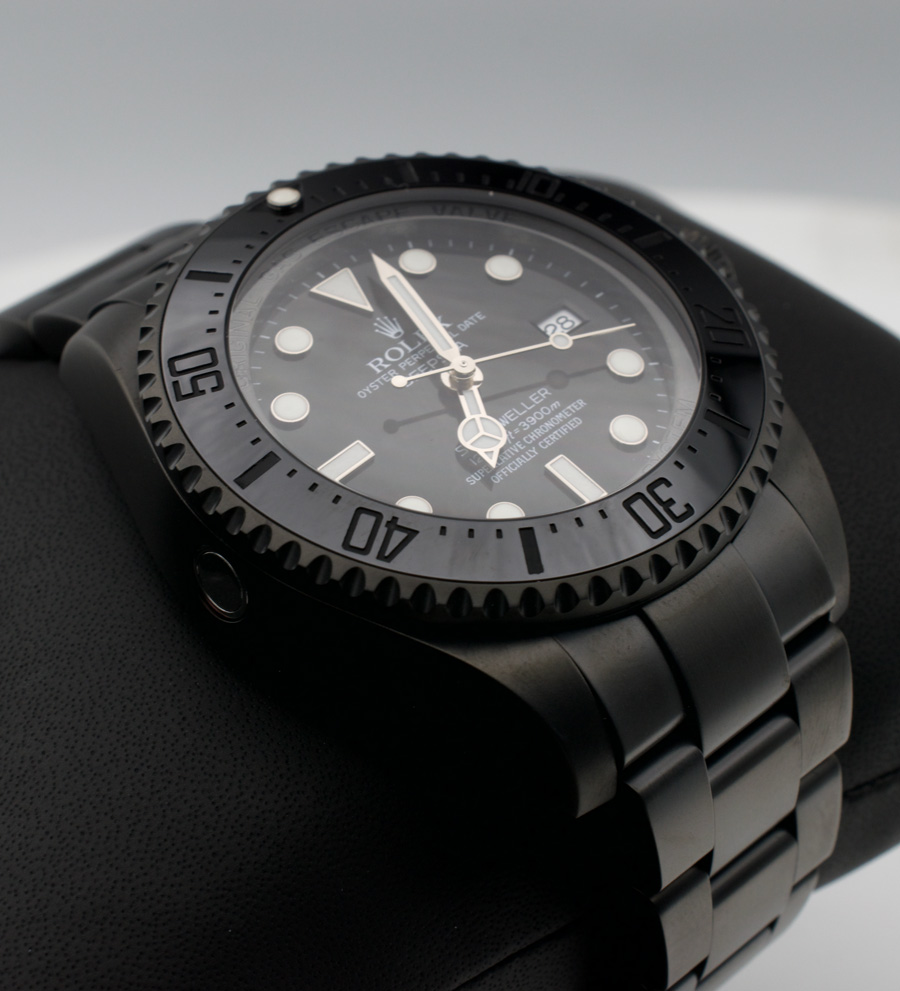 رولكس ديبسي سي-دويلر 116660 بلاك فينوم هو إصدار محدود فائق الندرة من ٣٥ قطعة فقط. مصنوع بعلبة عملاقة من الأويسترستيل بقطر ٤٤ ملم، يتميز بطبقة PVD سوداء تغطي العلبة والسوار بالكامل، مما يمنحه مظهرًا خفيًا ومخيفًا بأسلوب "فينوم". الميناء الأسود مع علامات وساعات بيضاء كبيرة يوفر قراءة استثنائية، بينما إطار السيراميك سيراكروم الأسود مع تدريج ٦٠ دقيقة محفور يضمن توقيتًا دقيقًا. صمام هروب الهيليوم عند الساعة ٩ يضيف لمسة تقنية متقدمة. تعمل بحركة أوتوماتيكية باحتياطي طاقة. سوار الأويستر الثقيل مع قفل جليدلوك يوفر راحة وأمانًا. تحفة جريئة ومخيفة للجامعين الجادين الباحثين عن الندرة والأداء والحضور اللافت.