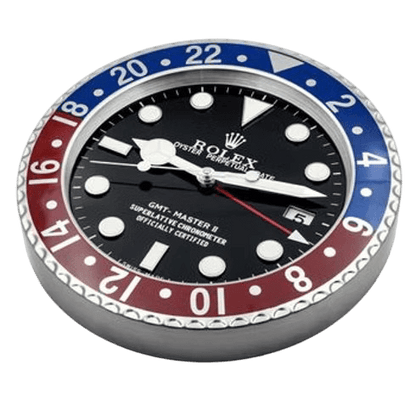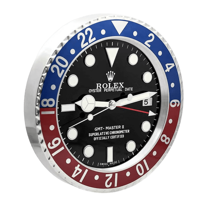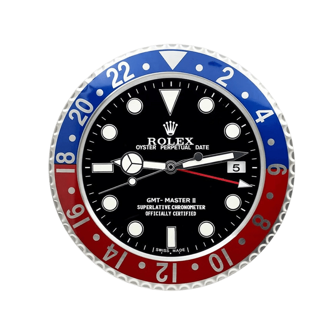ساعة الحائط رولكس جي إم تي ماستر ٢ بيبسي قطعة نابضة مستوحاة من ساعة الطيار الأيقونية بإطارها الأحمر والأزرق الشهير "بيبسي". قطرها نحو ٣٤ سم وعمقها الرفيع ٥ سم فقط، مع علبة من الفولاذ المصقول وإطار من السيراميك سيراكروم أحمر وأزرق مزود بأرقام ٢٤ ساعة لمظهر توقيت مزدوج أصيل. الميناء الأسود الكلاسيكي مزين بعقارب مرسيدس مضيئة وعلامات بارزة وعقرب جي إم تي أحمر مميز. تعمل بحركة كوارتز ناعمة وبطارية AA واحدة، فتضمن توقيتًا دقيقًا وهادئًا تمامًا. هذه القطعة الزخرفية الجذابة تضيف فخامة رولكس الخالدة وإرثها الجوي إلى أي منزل أو مكتب أو ركن عرض، وتوفق بين الاستخدام العملي والجمال الفاخر البارز. مثالية لمحبي رولكس الذين يعشقون الأسلوب الدائم لأشهر ساعات السفر في العالم.