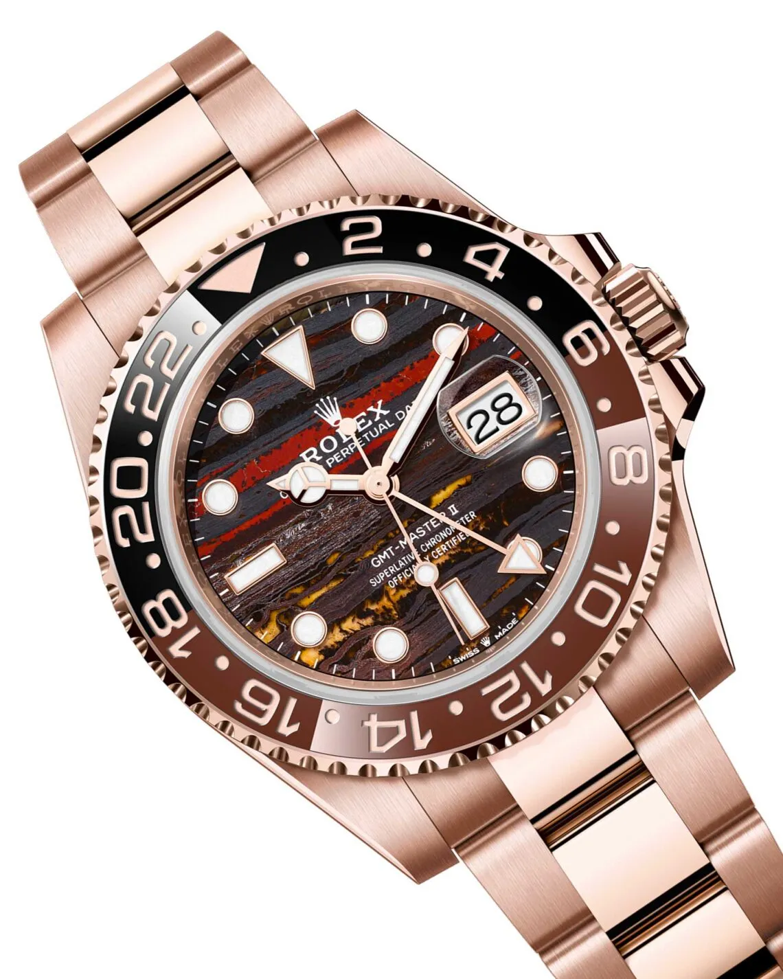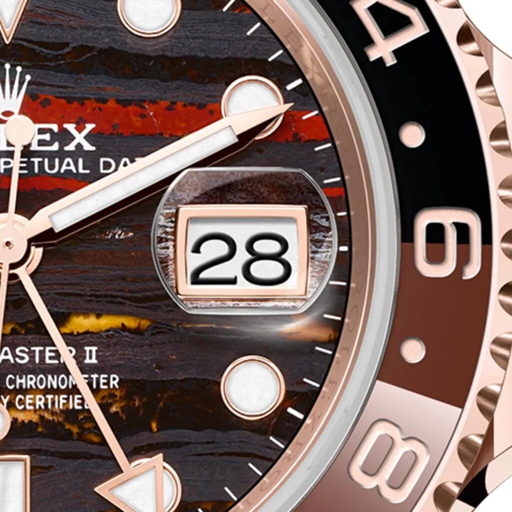 تُعد ساعة رولكس جي إم تي-ماستر 2 موديل 126715 تطورًا جريئًا لإحدى أكثر ساعات السفر الأيقونية من رولكس. يتميز الميناء الفريد بحجر طبيعي نادر يُعرف بـ "تايجر آيرون"، وهو مزيج من عين النمر واليشب الأحمر والهيماتيت، مما يجعل كل ميناء قطعة متفردة لا يشبه الآخر. تأتي الساعة بعلبة أويستر قياس 40 مم تجمع بين المتانة والأناقة، مع إطار سيراكروما ثنائي الاتجاه باللونين الأسود والبني يعزز طابعها المميز. يكتمل التصميم بسوار أويستر المتين، مما يجعل هذه الساعة مزيجًا مثاليًا من التميز والأداء والفخامة لعشاق السفر وهواة الجمع.