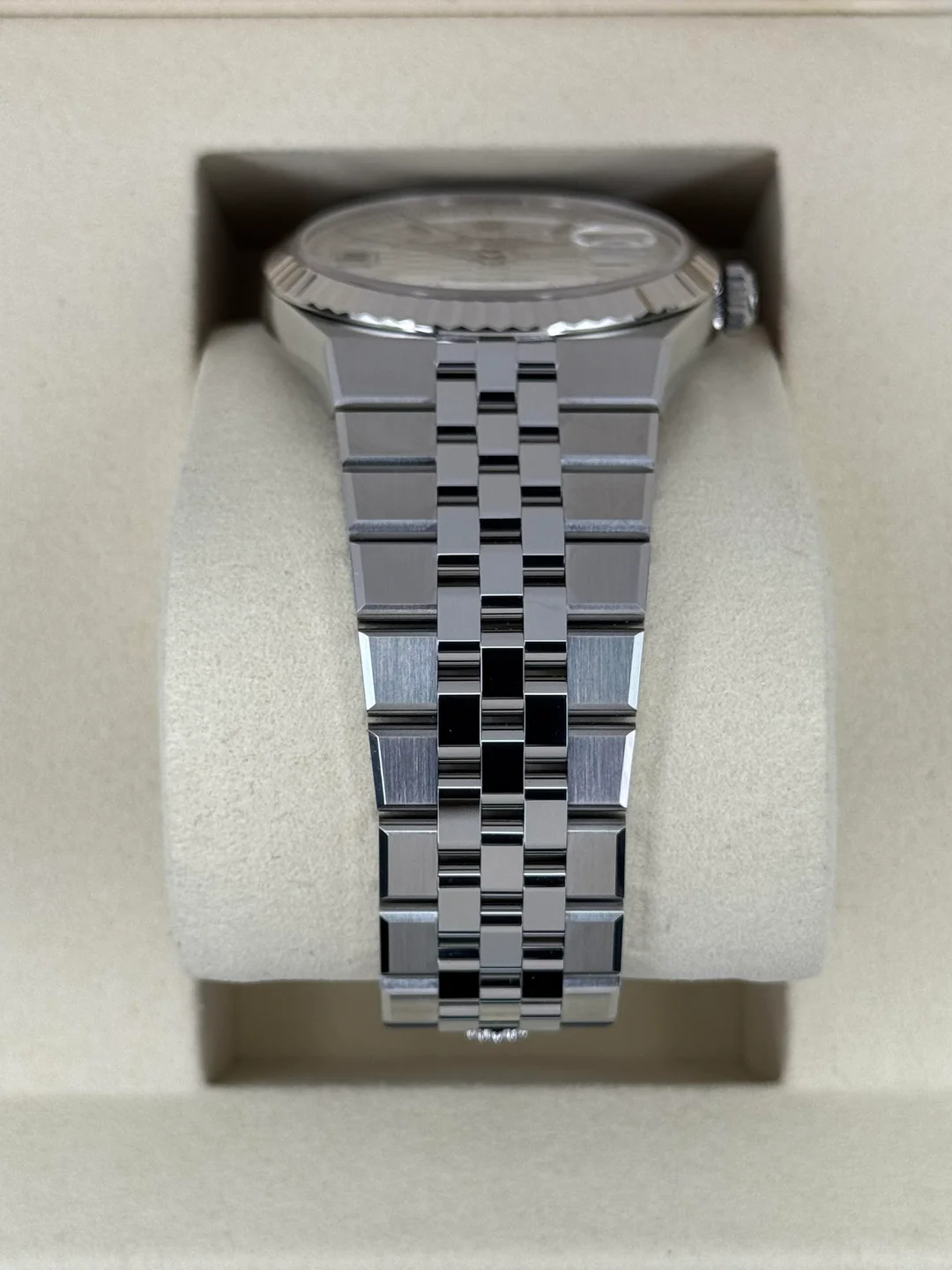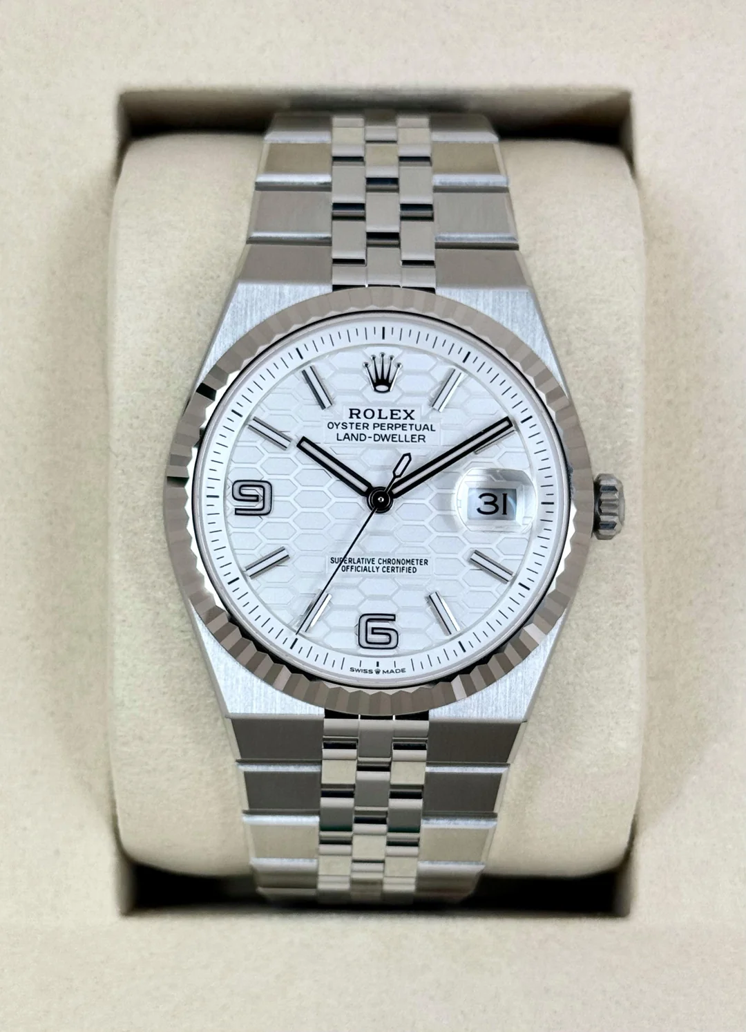 رولكس لاند-ديولر 127334 سوبر كلون هي نسخة طبق الأصل 1:1 من إصدار عام 2025، صُنعت بدقة متناهية لتطابق التصميم الأصلي بشكل كامل. تأتي بعلبة أويستر مقاس 40 مم من الفولاذ المقاوم للصدأ مع إطار مخدد بارز، مما يجمع بين الصلابة والأناقة الراقية.