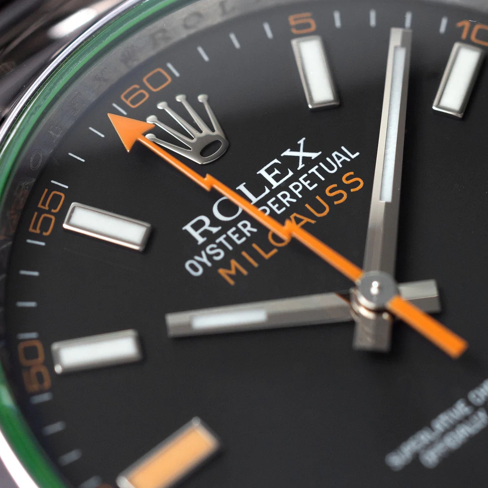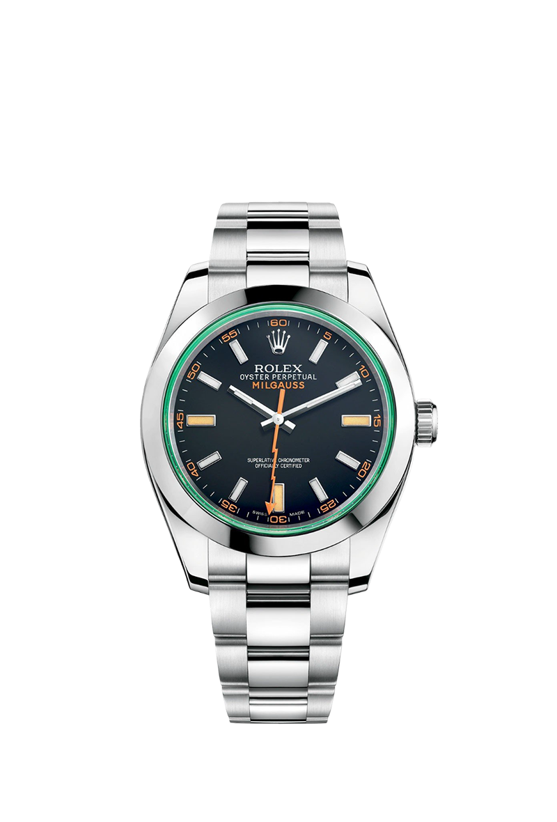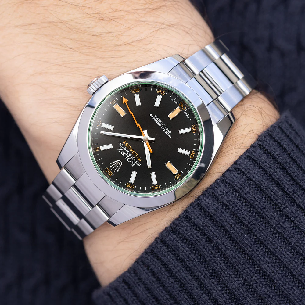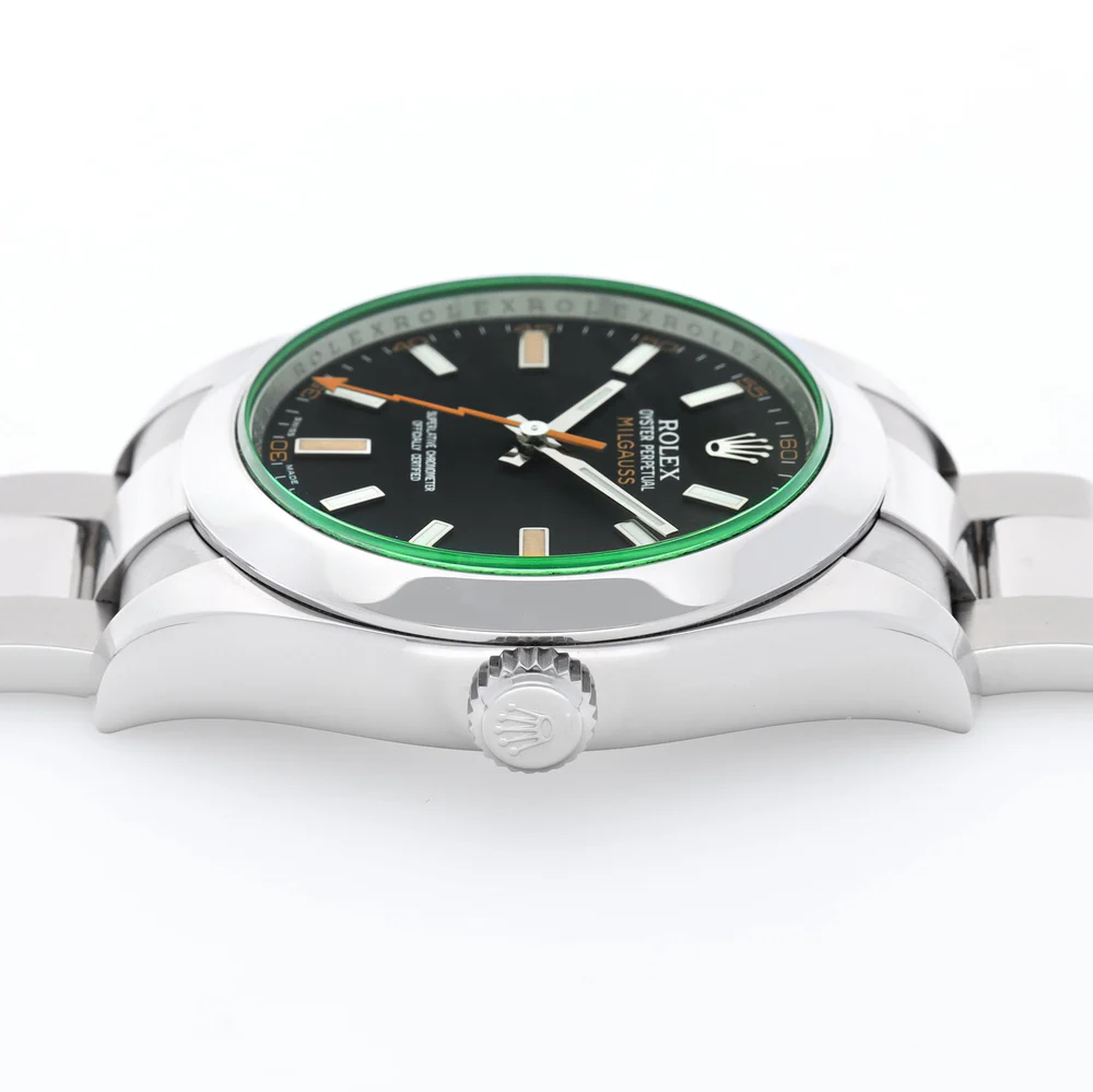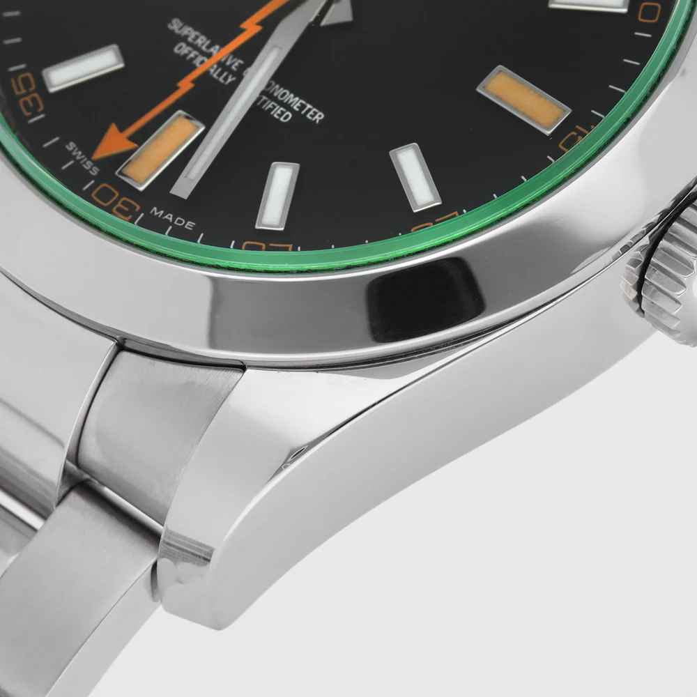 تُعد ساعة رولكس ميلجوس 116400GV بالميناء الأسود من الساعات المميزة التي تجمع بين الطابع العصري والتصميم الأيقوني لعلامة رولكس. تأتي الساعة بهيكل من الفولاذ المقاوم للصدأ بقياس 40 مم، وتتميز بزجاج ياقوتي أخضر فريد من نوعه (GV – Glace Verte) يمنحها حضورًا لافتًا وسهل التمييز.
