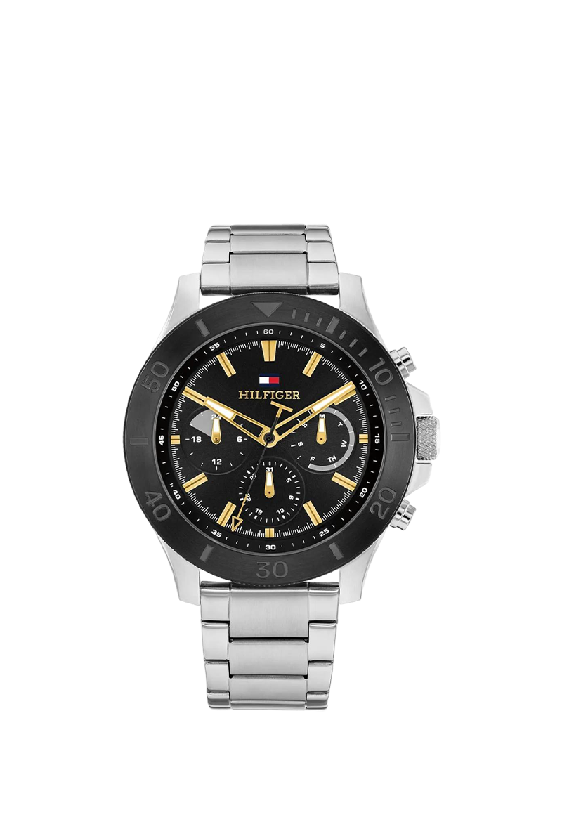 تومي هيلفيغر بريان 1792114 ساعة جريئة للرجال تجسد أسلوب العلامة الأمريكي البريبي الكلاسيكي بتصميم أسود وفضي لافت. تأتي بعلبة دائرية قوية من الفولاذ المقاوم للصدأ قطرها ٤٦ ملم وسمكها ١١ ملم، مع ميناء أسود داكن مزين بعقارب وعلامات مضيئة لقراءة ممتازة، وعرض تاريخ شهري وأسبوعي لعملية إضافية. سوار الفولاذ الفضي بعرض ٢٢ ملم يمنح ارتداءً فاخرًا ومريحًا بوزن ١٥٤ غرامًا. تعمل بحركة كوارتز دقيقة توفر توقيتًا موثوقًا ومقاومة للماء حتى ٥٠ مترًا. مصممة بأسلوب تومي هيلفيغر الديناميكي المميز، تفيض هذه الساعة التناظرية بالرقي السلس والتنوع، مما يجعلها قطعة يومية أساسية مثالية للرجل العصري الذي يقدر الحرفية المتينة والجاذبية الخالدة.