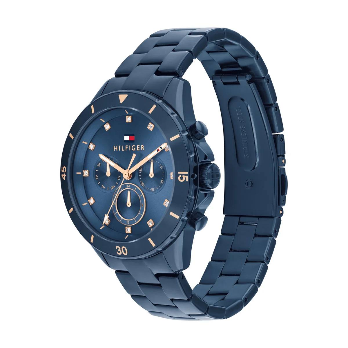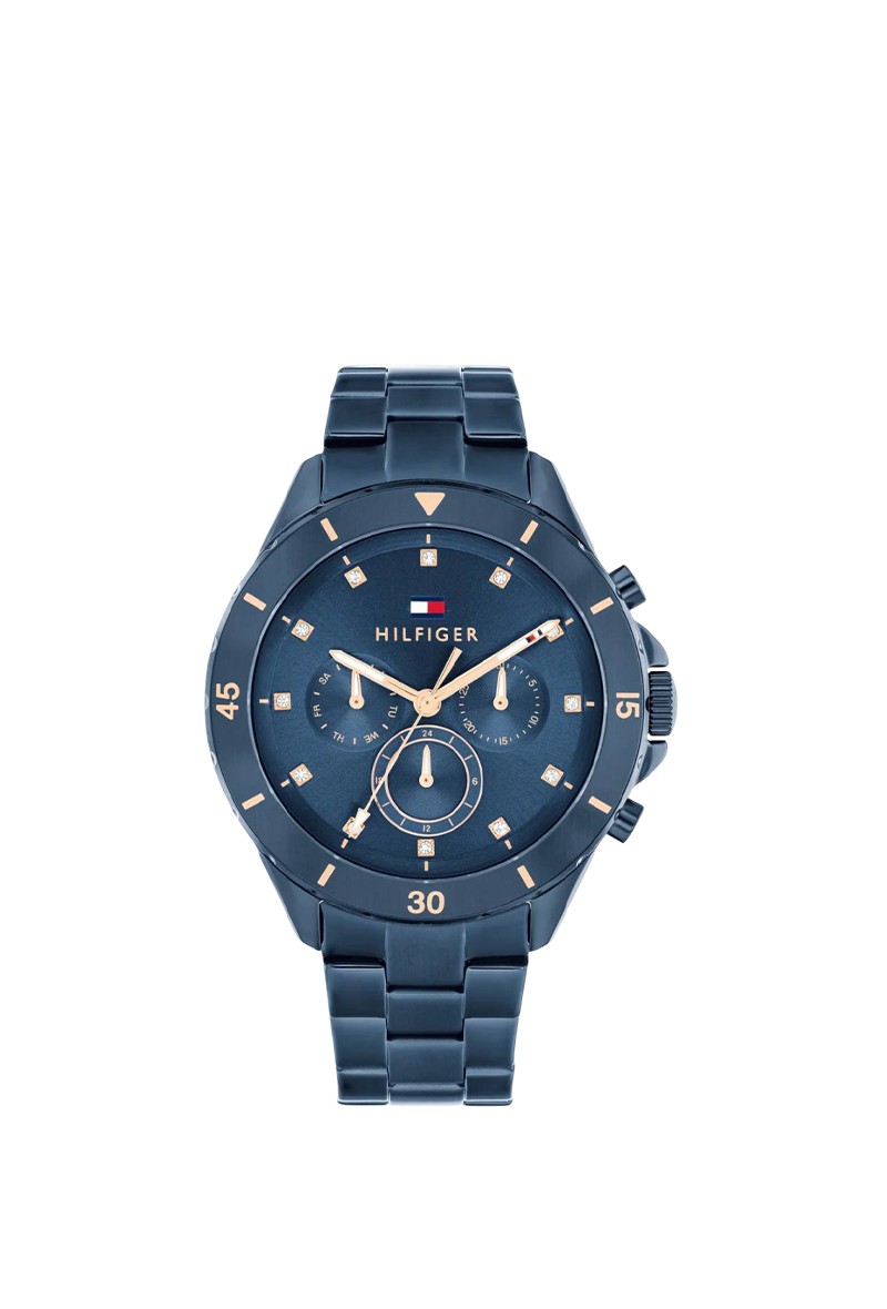 The Tommy Hilfiger Mellie 1782743 is a captivating women's watch that radiates the brand's iconic American preppy charm with a bold blue monochromatic allure. Encased in a polished 40mm round stainless steel body with an 11mm profile, its mesmerizing deep blue dial glows with luminous hands and applied indices, delivering razor-sharp readability while monthly and weekly date windows add subtle utility. The striking blue stainless steel bracelet, 19mm wide, drapes the wrist in premium comfort. Driven by precise quartz movement, it offers flawless timing and 50 meters water resistance. Crafted with Tommy Hilfiger's bold yet refined signature, this analog masterpiece exudes confident femininity and timeless vibrancy—perfect for the modern woman craving durable elegance and standout presence.