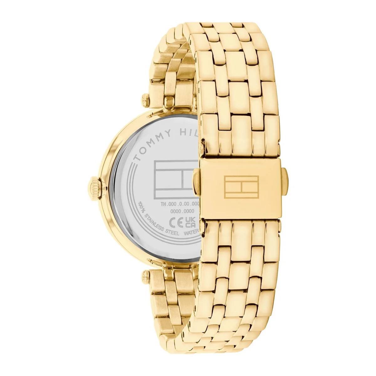 تومي هيلفيغر ناتالي 1782718 ساعة أنثوية مبهرة للسيدات تشع بجاذبية ذهبية ساحرة بالكامل. بعلبة دائرية صغيرة من الفولاذ قطرها ٣٤ ملم مزينة بزيركون لامع، يتألق ميناؤها الذهبي الفاخر تحت زجاج معدني بعقارب أنيقة لقراءة دقيقة. السوار الذهبي النحيف بعرض ٨ ملم مع قفل قابل للطي يلف المعصم براحة رائعة. مدفوعة بحركة سيكو Y121 كوارتز دقيقة، تقدم توقيتًا لا يخطئ ومقاومة للماء ٣ أتموسفير (٣٠ مترًا). مصممة بتوقيع تومي هيلفيغر الجريء الراقي، تفيض هذه الجوهرة التناظرية بالأناقة الواثقة واللمعان الخالد – مثالية للمرأة العصرية التي تشتهي الفخامة الخفيفة والتألق اللافت والأسلوب السلس في كنز يومي آسر.