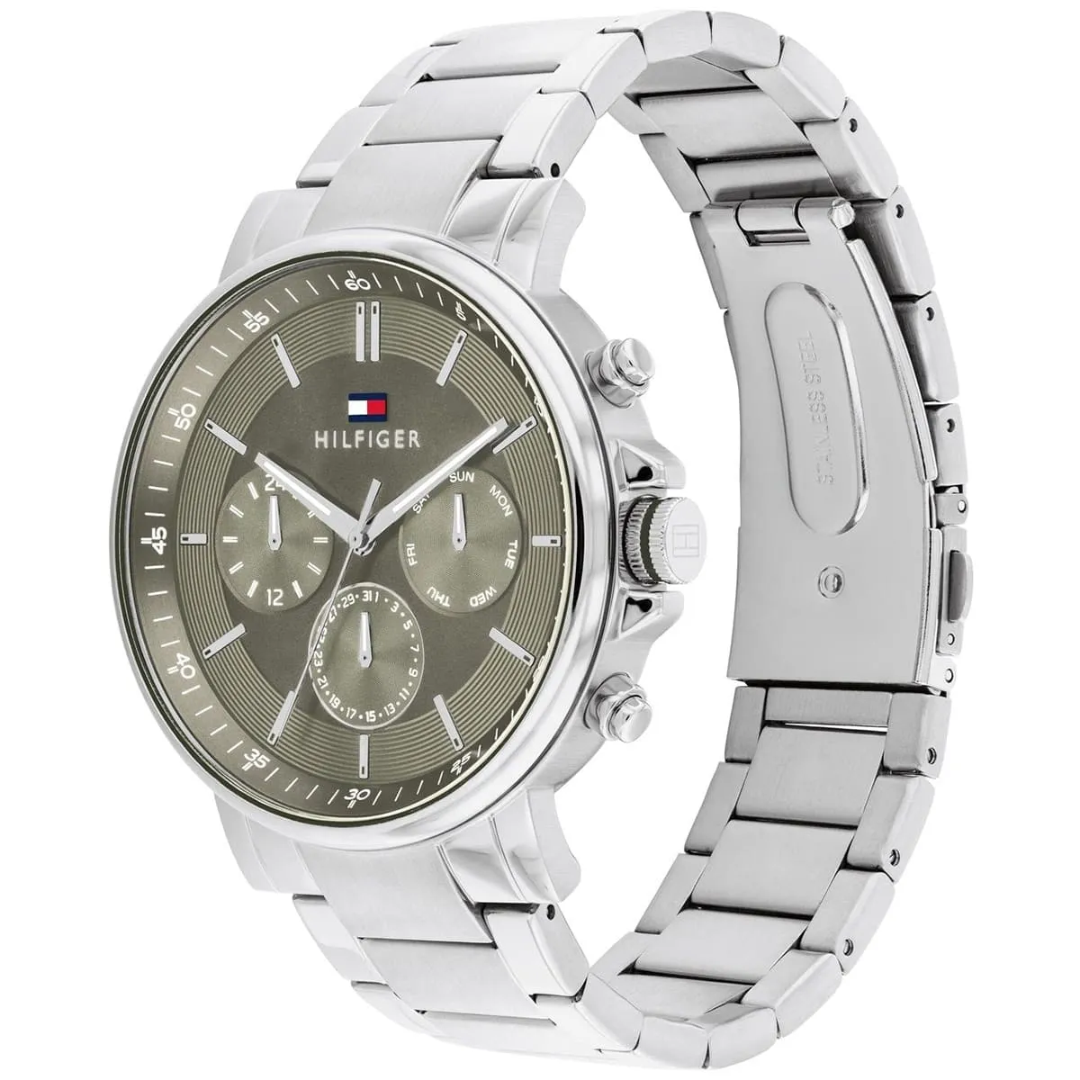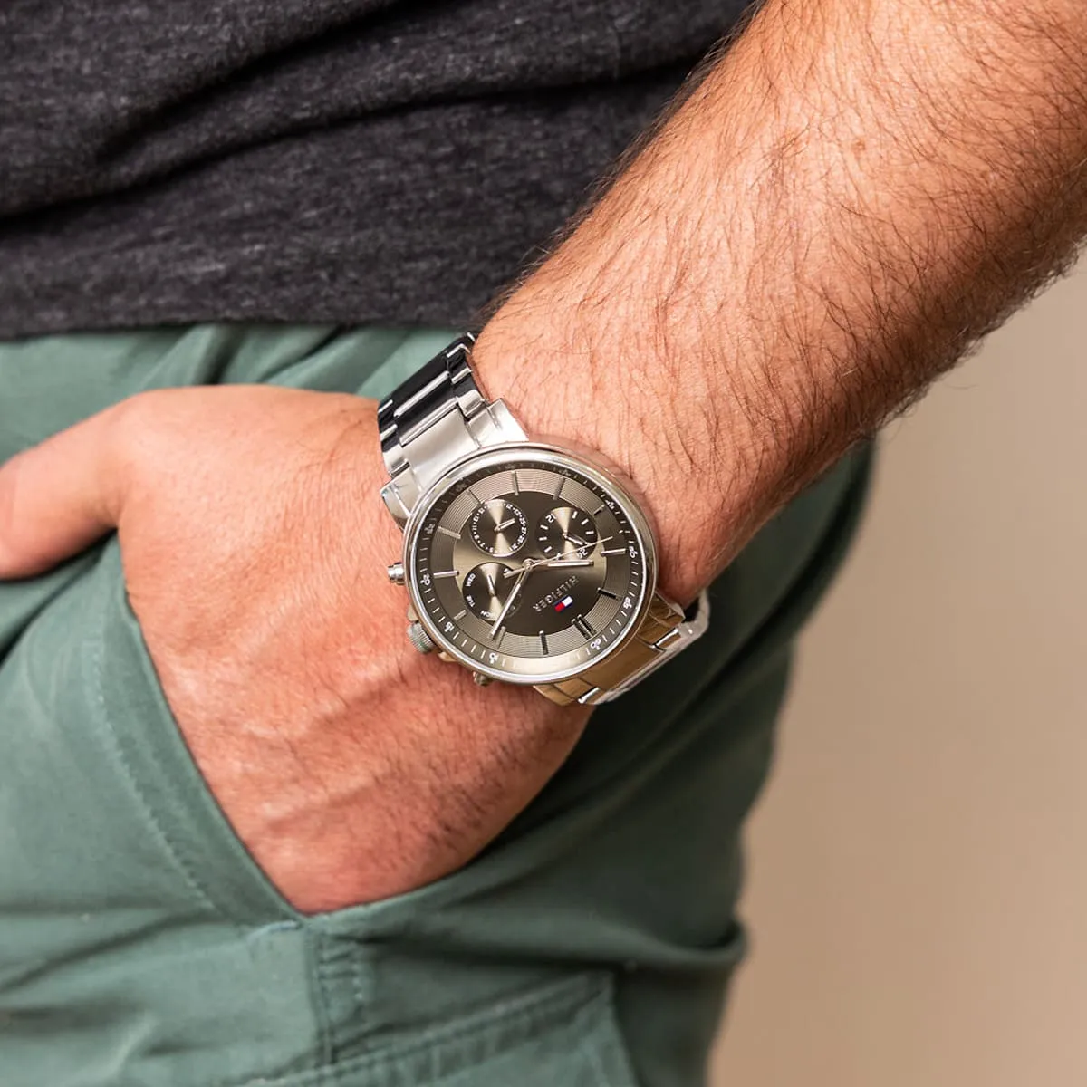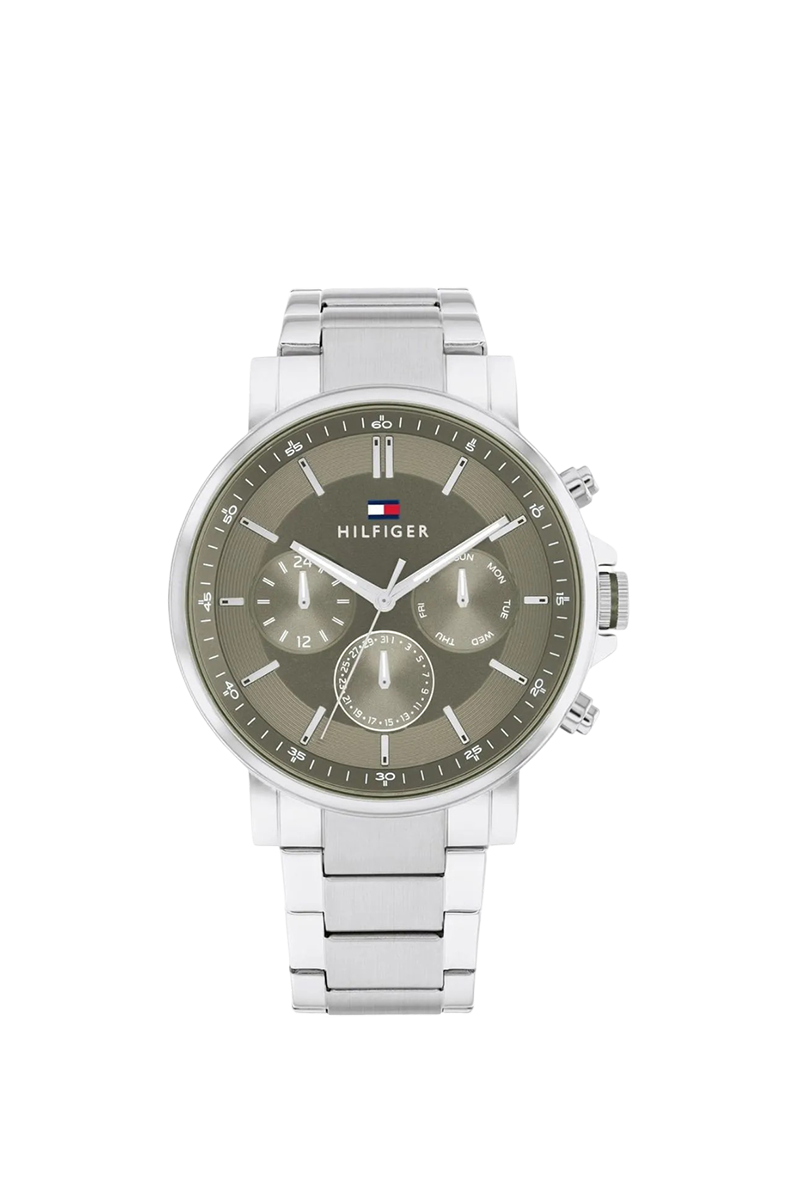 تومي هيلفيغر تايسون 1710587 ساعة عصرية للرجال تجسد برودة الأمريكية الكلاسيكية للعلامة مع وظائف حديثة. تأتي بعلبة دائرية مصقولة من الفولاذ المقاوم للصدأ قطرها ٤٤ ملم وسمكها النحيف ١٠ ملم، مع ميناء رمادي راقٍ مزين بعقارب وعلامات مضيئة لقراءة ممتازة، وعرض تاريخ شهري وأسبوعي لعملية إضافية. سوار الفولاذ الفضي بعرض ٢٢ ملم يمنح ارتداءً فاخرًا ومريحًا. تعمل بحركة كوارتز دقيقة توفر توقيتًا موثوقًا ومقاومة للماء حتى ٥٠ مترًا. مصممة بأسلوب تومي هيلفيغر البريبي المميز، تفيض هذه الساعة التناظرية بالتنوع السلس والأسلوب، مما يجعلها إكسسوارًا يوميًا مثاليًا للرجل العصري الذي يقدر الحرفية المتينة والرقي الخفيف والجاذبية الخالدة في ساعة يومية موثوقة.