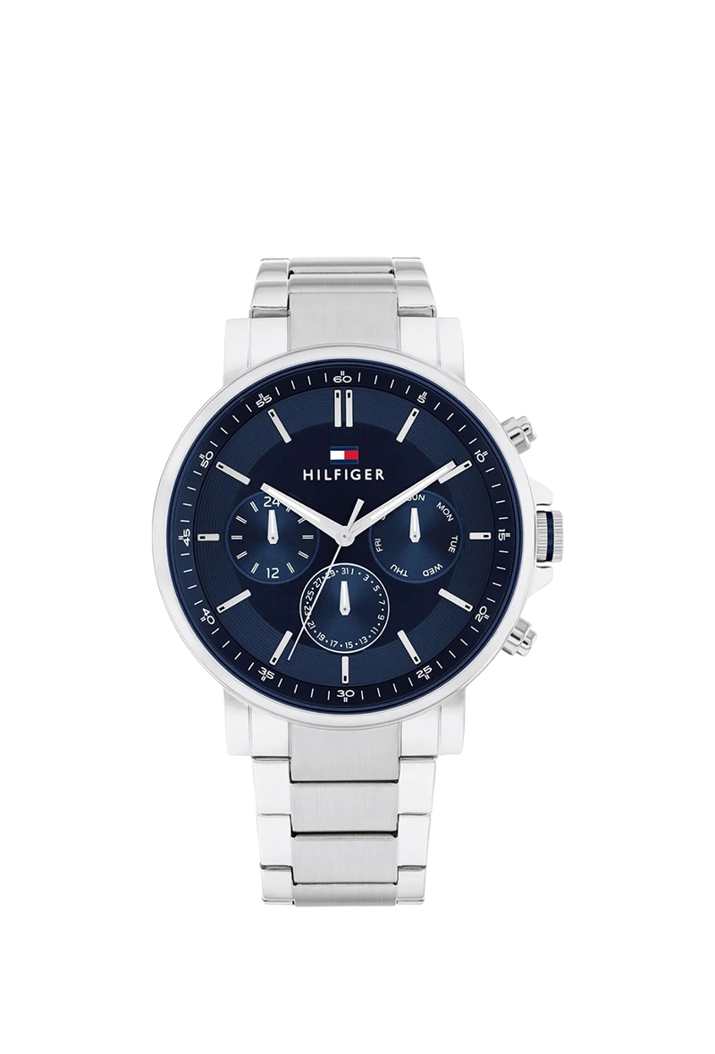 تومي هيلفيغر تايسون 1710588 ساعة عصرية للرجال تجسد برودة الأمريكية الكلاسيكية للعلامة مع وظائف حديثة. تأتي بعلبة دائرية مصقولة من الفولاذ المقاوم للصدأ قطرها ٤٤ ملم وسمكها النحيف ١٠ ملم، مع ميناء أزرق آسر مزين بعقارب وعلامات مضيئة لقراءة ممتازة، وعرض تاريخ شهري وأسبوعي لعملية إضافية. سوار الفولاذ الفضي بعرض ٢٢ ملم يمنح ارتداءً فاخرًا ومريحًا. تعمل بحركة كوارتز دقيقة توفر توقيتًا موثوقًا ومقاومة للماء حتى ٥٠ مترًا. مصممة بأسلوب تومي هيلفيغر البريبي المميز، تفيض هذه الساعة التناظرية بالتنوع السلس والأسلوب، مما يجعلها إكسسوارًا يوميًا مثاليًا للرجل العصري الذي يقدر الحرفية المتينة واللون الجريء والجاذبية الخالدة في ساعة يومية موثوقة.