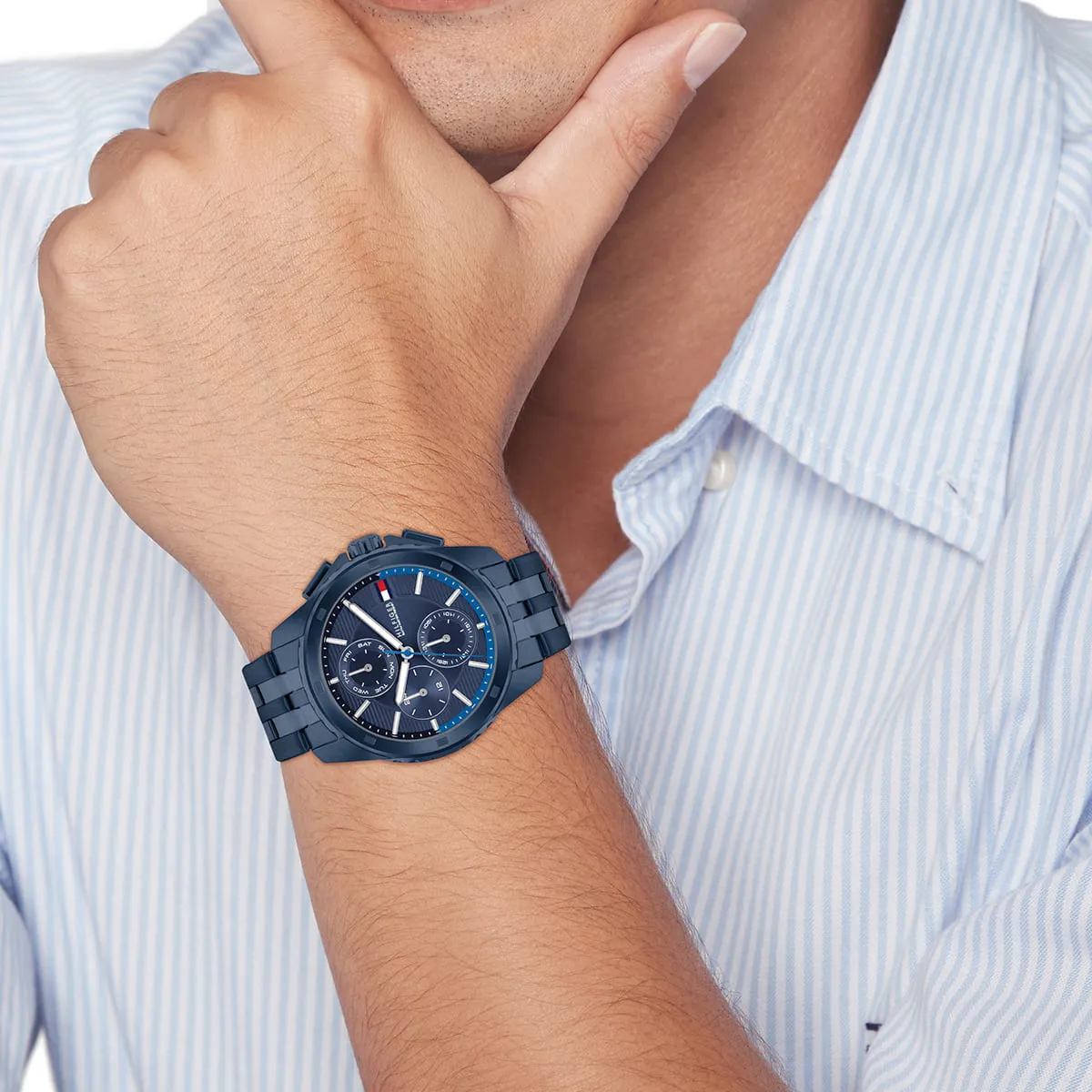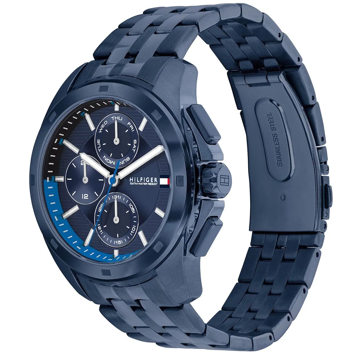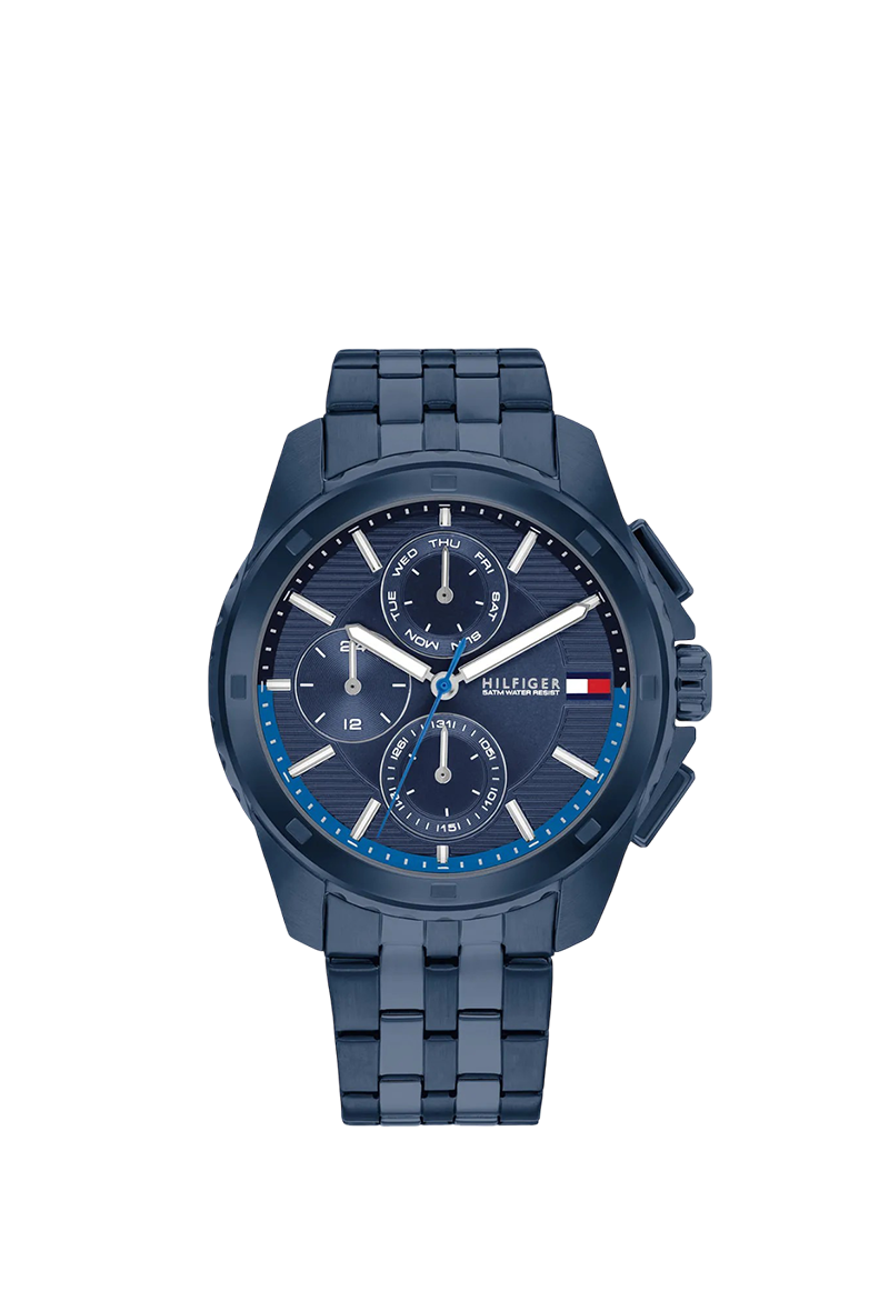 تومي هيلفيغر ووكر 1710622 ساعة لافتة للرجال تجسد أسلوب العلامة الأمريكي البريبي الكلاسيكي بتصميم أحادي اللون نافي جريء. تأتي بعلبة دائرية مصقولة من الفولاذ المقاوم للصدأ قطرها ٤٤ ملم وسمكها ١٢ ملم، مع ميناء نافي عميق مزين بعقارب وعلامات مضيئة لقراءة ممتازة، وعرض تاريخ شهري وأسبوعي لعملية إضافية. سوار الفولاذ النافي بعرض ٢٢ ملم يمنح مظهرًا متناسقًا فاخرًا وراحة بوزن ١٦٣ غرامًا. تعمل بحركة كوارتز دقيقة توفر توقيتًا موثوقًا ومقاومة للماء حتى ٥٠ مترًا. مصممة بأسلوب تومي هيلفيغر الرفيع المميز، تفيض هذه الساعة التناظرية بالرقي السلس والتنوع، مما يجعلها إكسسوارًا يوميًا مثاليًا للرجل العصري الذي يقدر الحرفية المتينة والجاذبية الخالدة.