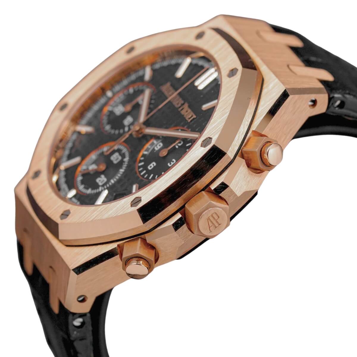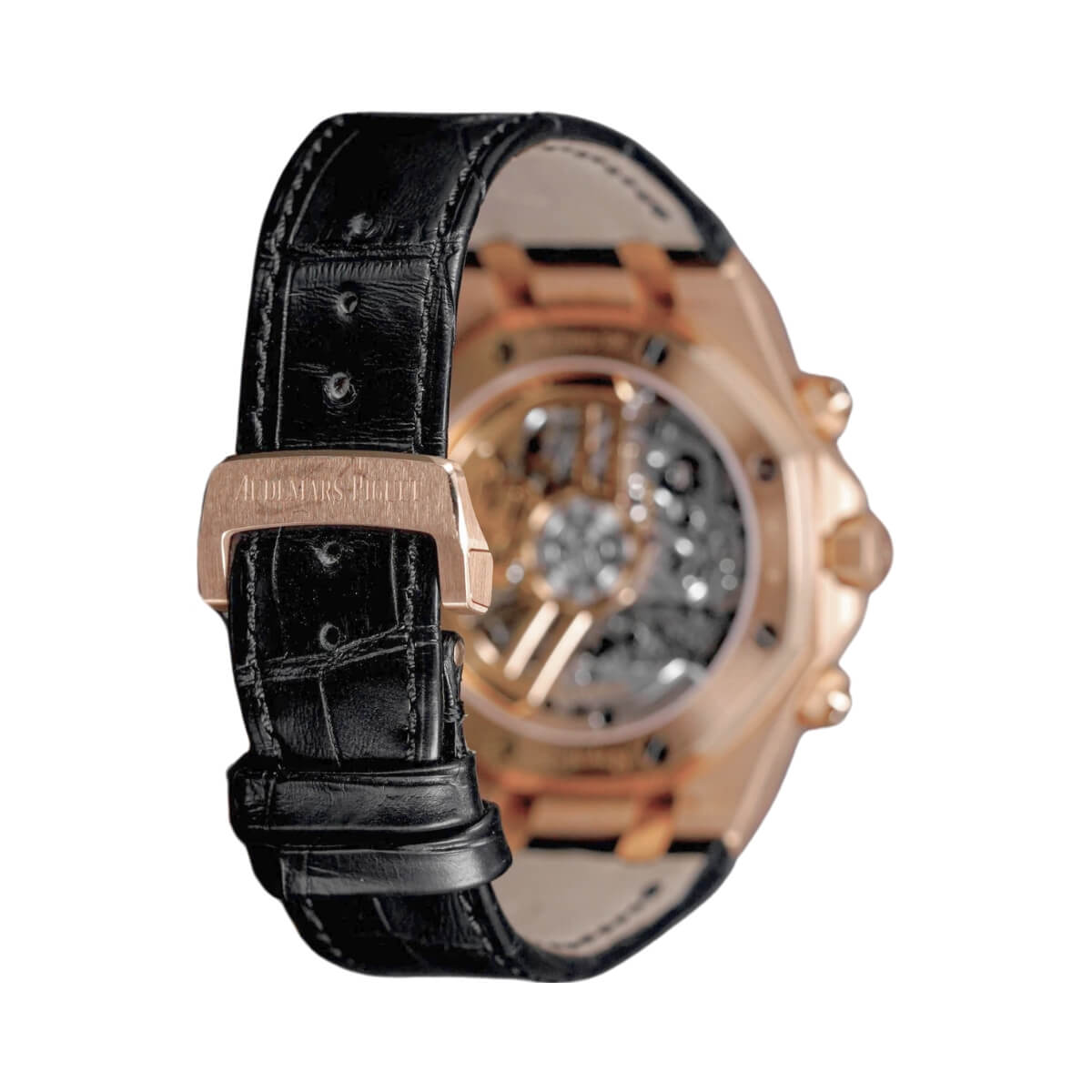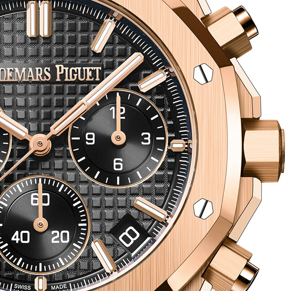 This chronograph is presented on a hand-stitched black alligator strap, secured with a rose gold AP folding clasp. A perfect fusion of timeless craftsmanship and contemporary refinement.