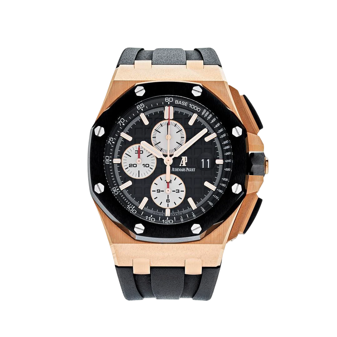 Powered by a selfwinding chronograph movement, this Offshore model combines precision with robustness. Completed with a black rubber strap and rose gold AP pin buckle, the 26400RO.OO.A002CA.01 is a commanding timepiece that blends modern sportiness with timeless refinement—crafted for collectors who seek both performance and prestige.