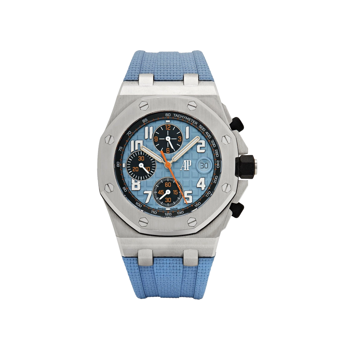 The Audemars Piguet Royal Oak Offshore 26238ST.OO.A340CA.01 combines bold design with technical mastery. Its 42mm stainless steel case is paired with a vibrant blue rubber strap, creating a sporty yet refined aesthetic that defines the Offshore collection.