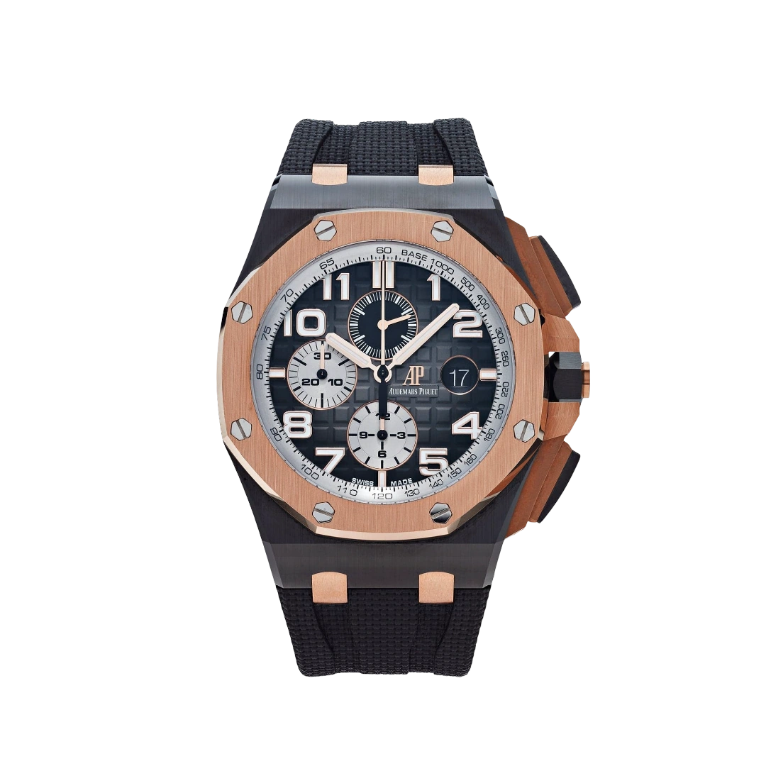The Audemars Piguet Royal Oak Offshore 26405NR.OO.A002CA.01 is a bold showcase of avant-garde design and luxury craftsmanship. Its 44mm black ceramic case is paired with a rose gold octagonal bezel, combining cutting-edge durability with timeless elegance.