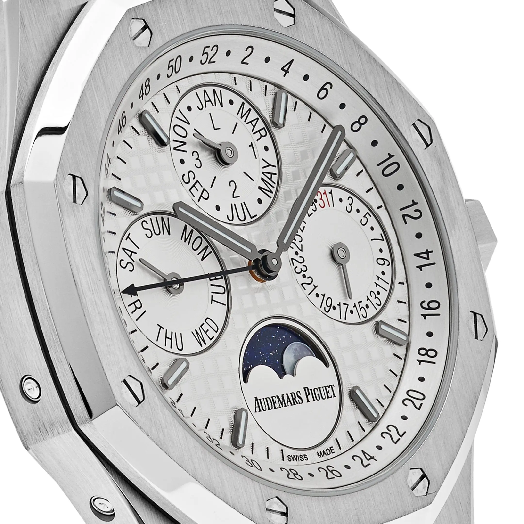 Its silver-toned “Grande Tapisserie” dial is beautifully balanced, hosting four subdials that indicate the day, date, month, leap year, and a detailed astronomical moon phase. A week-of-the-year scale encircling the dial adds further utility, making this perpetual calendar one of the most functional and visually harmonious in haute horology. White gold applied markers and luminescent Royal Oak hands ensure excellent legibility.
