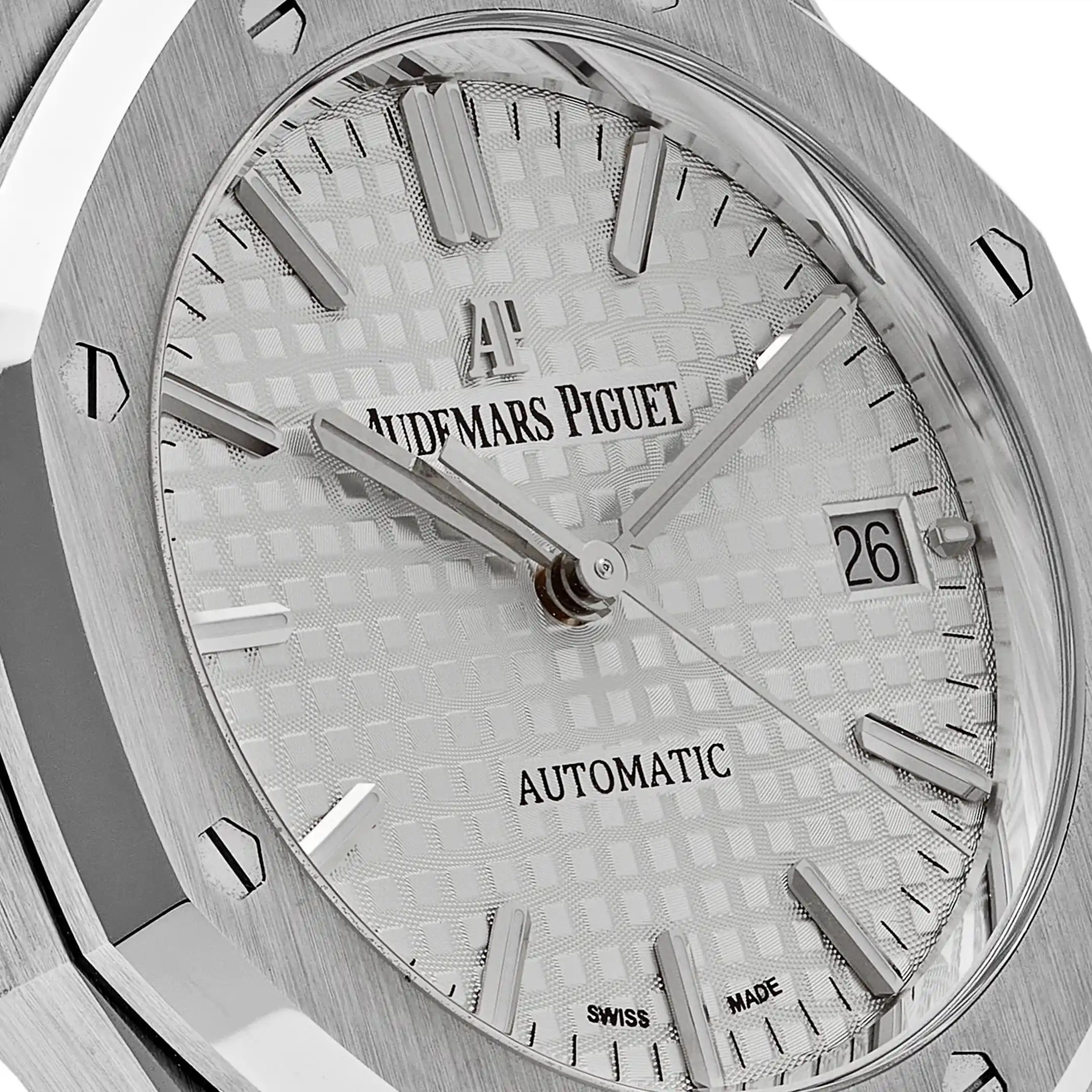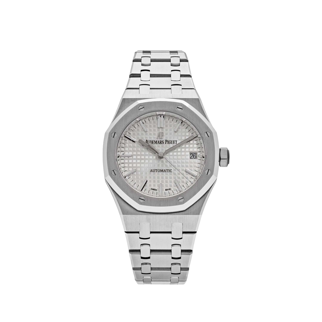 The silver-white Grande Tapisserie dial radiates elegance and clarity, featuring applied white gold hour markers and luminescent Royal Oak hands for uncompromised legibility. A discreet date display at 3 o’clock integrates seamlessly into the balanced layout, maintaining the clean aesthetic.