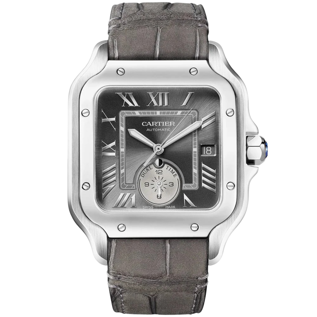 The Cartier Santos de Cartier Dual Time Large WSSA0076 in leather edition combines sophistication with functionality. Its 40mm stainless steel case frames a grey sunray-brushed dial featuring dual time, day/night display, and date function. The polished Roman numerals and luminous hands reflect Cartier’s timeless design, while the grey alligator leather strap enhances comfort and elegance—perfect for refined travelers seeking modern versatility.