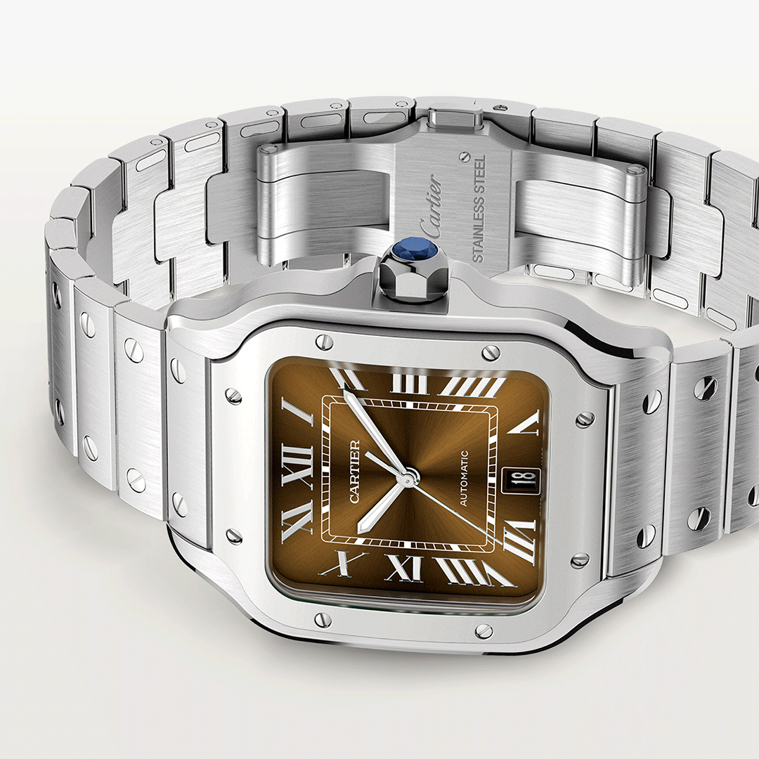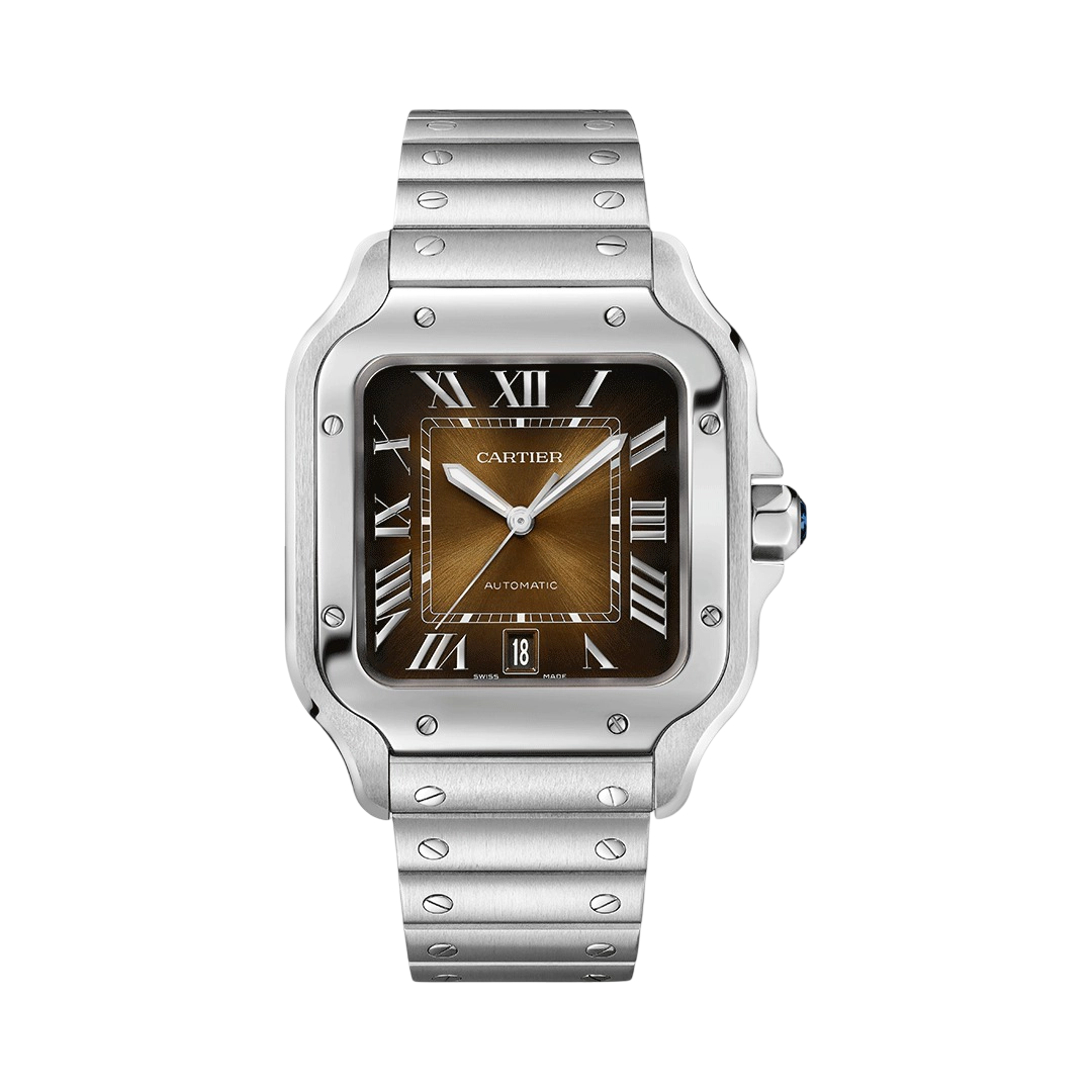 The Cartier Santos de Cartier Large WSSA0064 exudes warmth and sophistication with its 39.8 mm stainless steel case and rich chocolate-brown sunburst dial. The gradient tones deepen toward the edges, accentuated by bold Roman numerals, sword-shaped hands, and a date window at 6 o’clock. Powered by Cartier’s automatic, this elegant timepiece blends precision, luxury, and contemporary style—making it a distinctive choice for modern collectors.