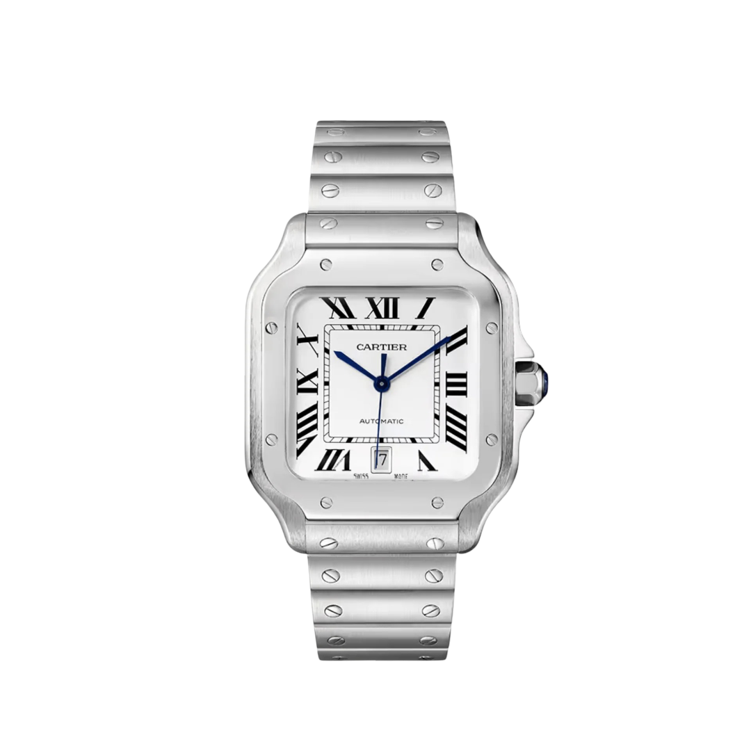 The Cartier Santos de Cartier Large WSSA0018 is a premium super-clone timepiece crafted to mirror the original with exceptional accuracy. It features a 39.8 mm stainless steel case with polished and brushed finishing, complemented by a silvered white dial showcasing bold black Roman numerals and blued-steel sword hands. The watch includes a perfectly placed date window at 6 o’clock. Powered by a high-quality automatic movement, this super-clone delivers outstanding precision, durability, and versatile elegance suitable for modern style and everyday wear.