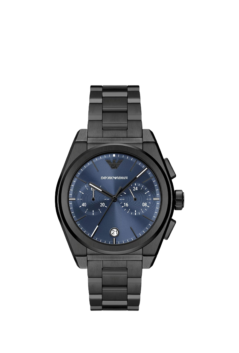 The Emporio Armani Federico AR11561 is a striking men's chronograph that embodies Giorgio Armani's sleek Italian sophistication. Housed in a polished 43mm round stainless steel case with a slim 10mm profile, its captivating blue dial features luminous hands and indices for excellent legibility, complemented by chronograph subdials, a monthly date window, and stopwatch functionality. The black stainless steel bracelet with 20mm width offers a bold, monochromatic contrast and comfortable wear. Powered by reliable quartz movement, it delivers precise performance and 50 meters water resistance. Designed with Armani's signature modern elegance, this versatile timepiece seamlessly blends sporty chronograph utility with understated luxury, making it an ideal choice for the contemporary man who appreciates durability, precision, and distinctive style in everyday refinement.