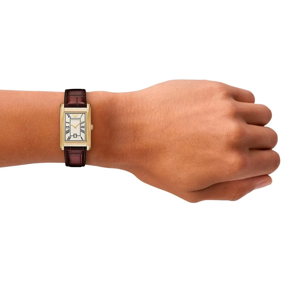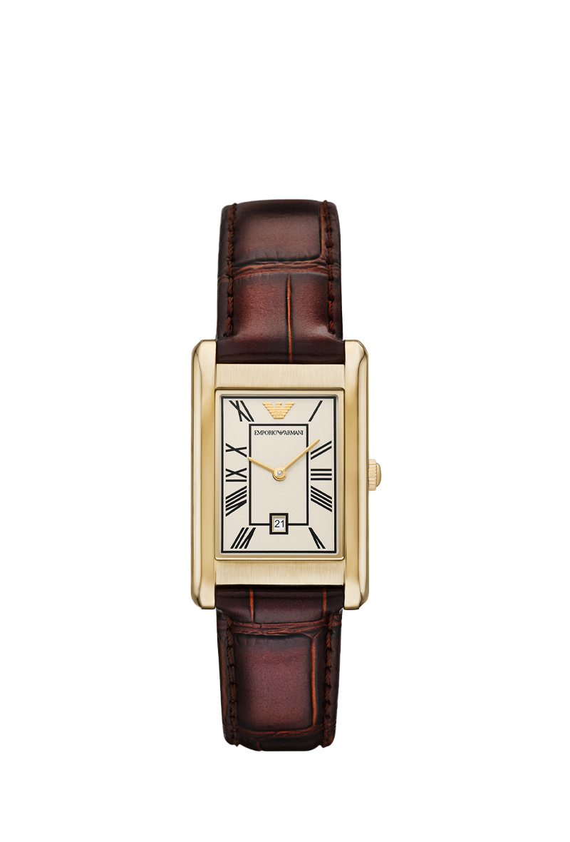 The Emporio Armani Gino AR11665 is a refined and minimalist men's watch that captures Giorgio Armani's essence of quiet luxury. Featuring a distinctive square 25mm case with an ultra-slim 5mm profile, its elegant beige dial offers a clean analog display with luminous hands for subtle legibility and a discreet monthly date window. The genuine brown leather strap with 18mm width ensures lightweight comfort at just 33 grams. Powered by reliable quartz movement, it provides precise timekeeping and 50 meters water resistance. Designed with Armani's sophisticated Italian flair, this compact timepiece exudes timeless elegance and versatility, making it an ideal accessory for the modern gentleman who appreciates slim, understated style with premium craftsmanship in a unique everyday watch that stands out through refined simplicity.