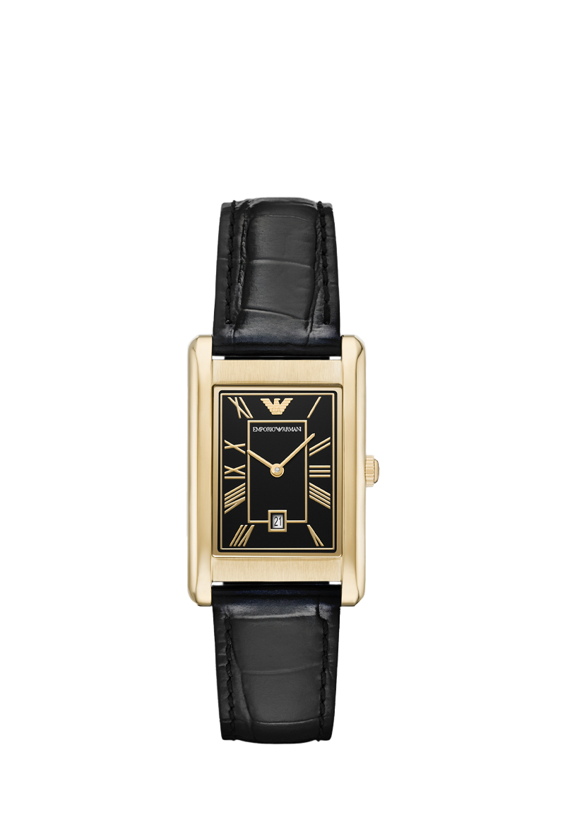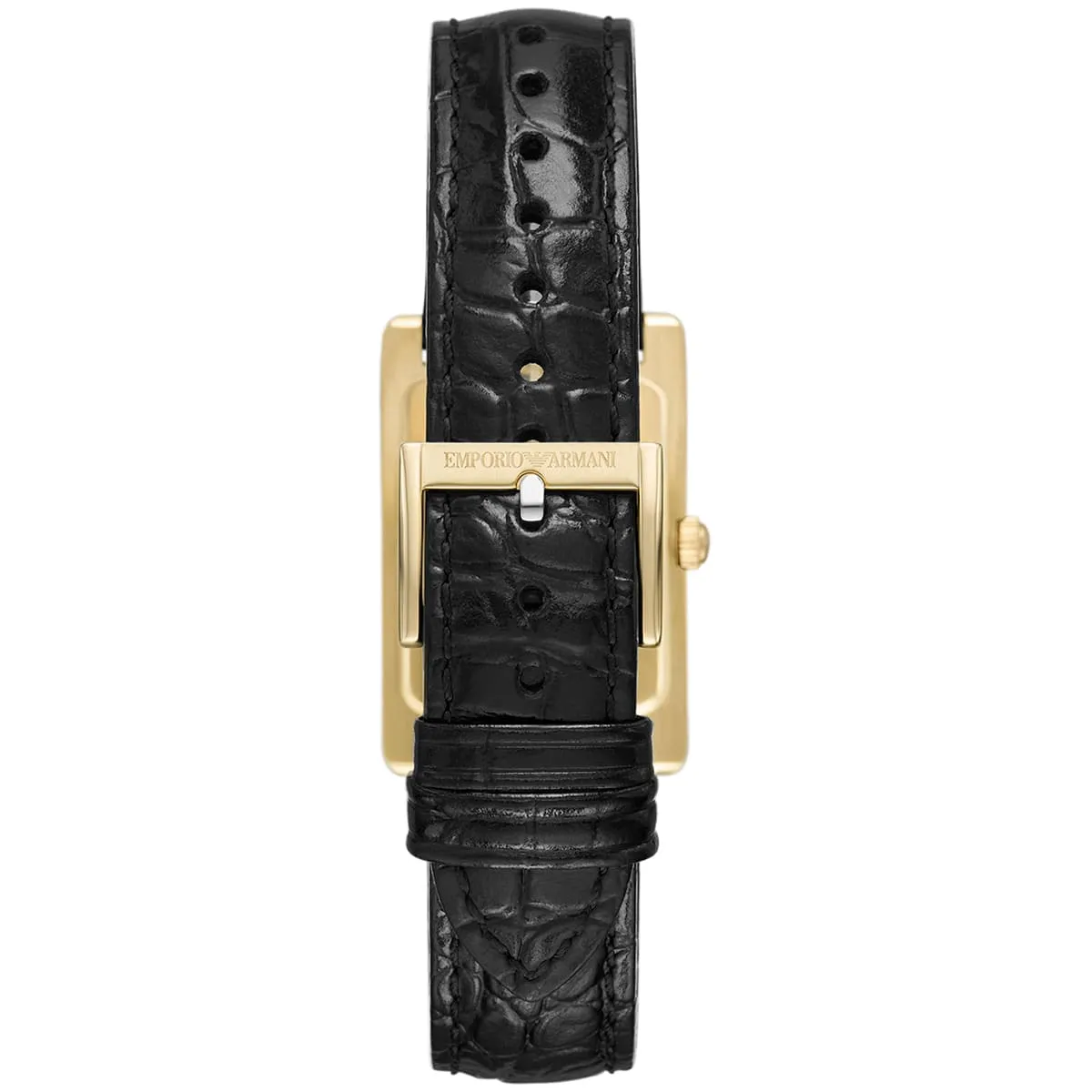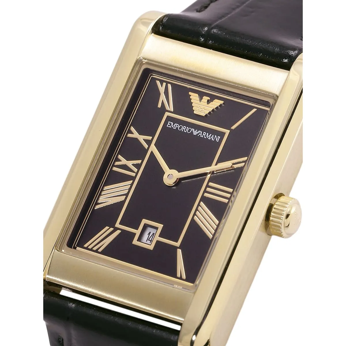 The Emporio Armani Gino AR11666 is a sleek and minimalist men's watch that embodies Giorgio Armani's signature understated elegance. Featuring a distinctive square 25mm case with an ultra-slim 5mm profile, its sophisticated black dial offers clean analog display with luminous hands for subtle legibility and a discreet monthly date window. The genuine black leather strap with 18mm width ensures lightweight comfort at just 33 grams. Powered by reliable quartz movement, it provides precise timekeeping and 50 meters water resistance. Designed with Armani's refined aesthetic, this compact timepiece exudes quiet luxury and versatility, making it an ideal accessory for the modern gentleman who appreciates slim, sophisticated style with Italian craftsmanship in a distinctive everyday watch that stands out through simplicity.