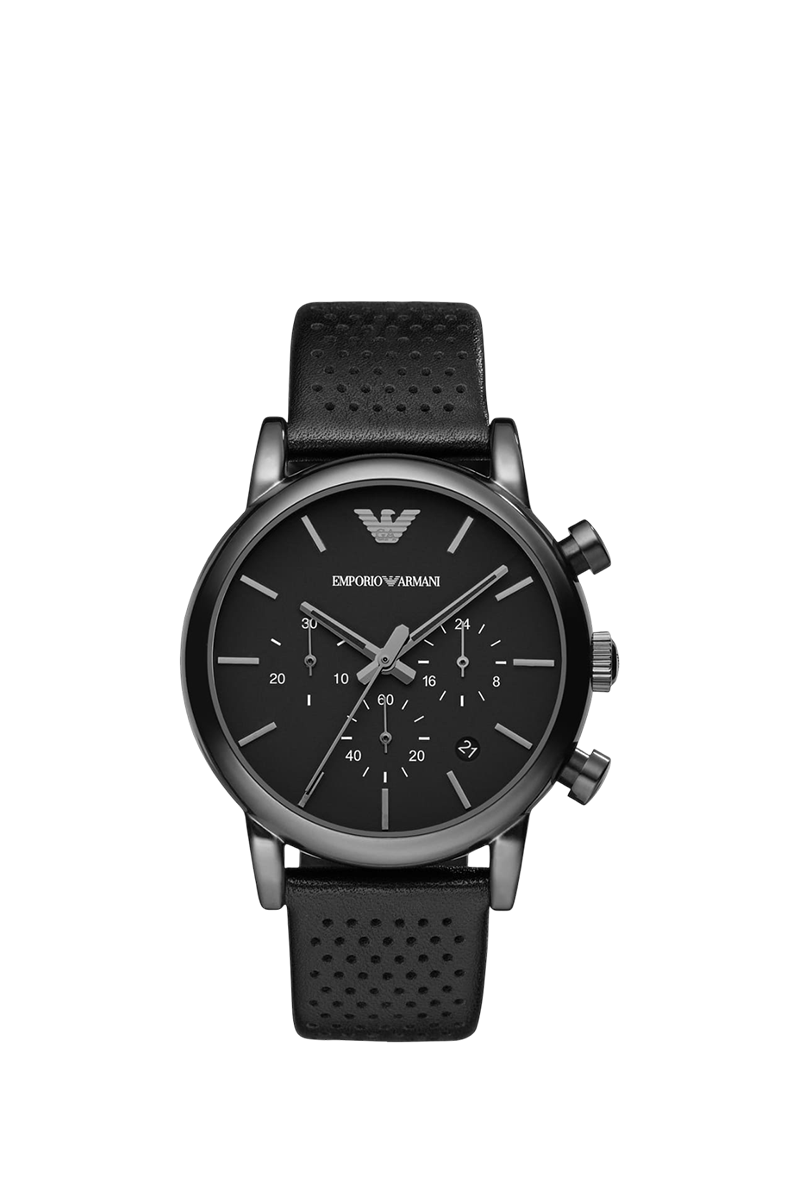 The Emporio Armani Luigi AR1737 is a sleek men's chronograph that embodies Giorgio Armani's refined Italian sophistication. Housed in a polished 41mm round stainless steel case with a 12.5mm thickness, its intense black dial features luminous hands and indices for superior legibility, complemented by chronograph subdials, a monthly date window, and stopwatch functionality. The genuine black leather strap with 20mm width offers premium comfort at just 73 grams. Powered by reliable quartz movement, it delivers precise performance and 50 meters water resistance. Designed with Armani's signature minimalist elegance, this versatile timepiece seamlessly blends sporty chronograph utility with understated luxury, making it an ideal everyday watch for the modern gentleman who appreciates durable craftsmanship, precision, and timeless style.