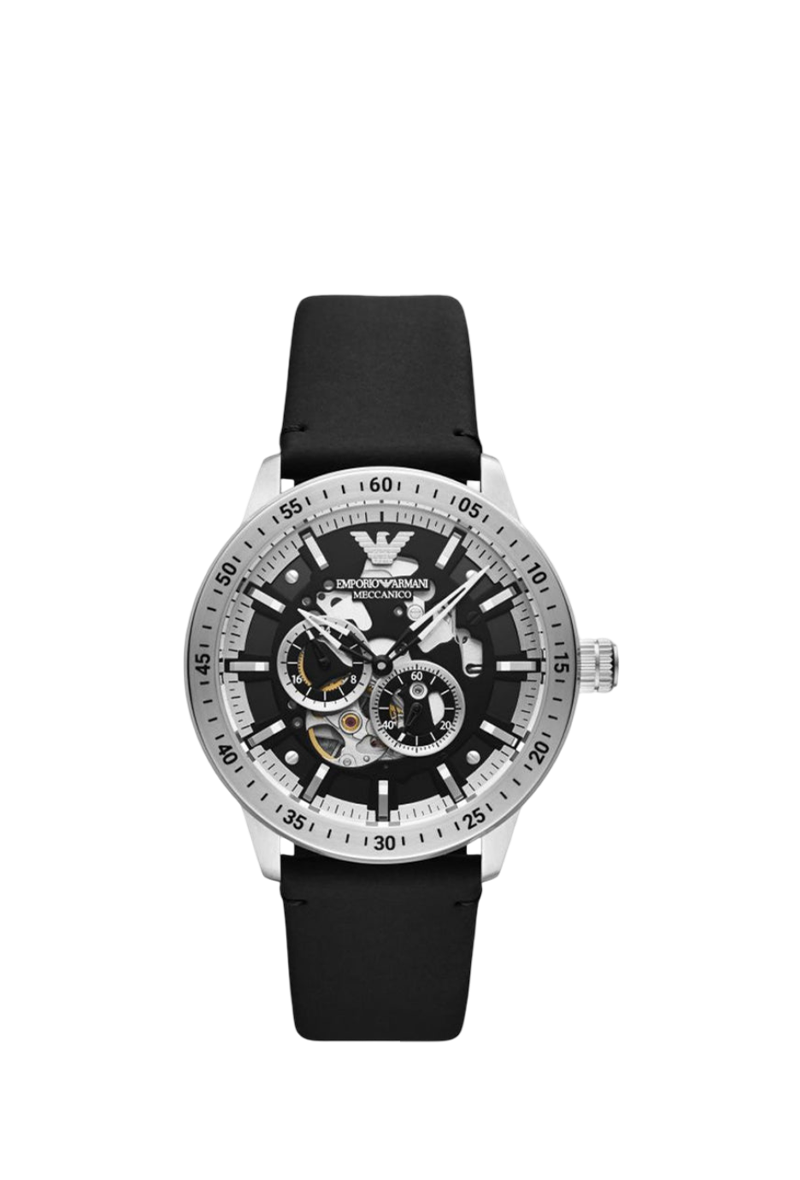 The Emporio Armani Mario AR60051 is a sophisticated men's automatic watch that embodies Giorgio Armani's timeless Italian elegance. Housed in a robust 43mm round stainless steel case with a 13mm thickness, its sleek black dial features luminous hands and applied indices for excellent legibility in any light. The genuine black leather strap with 22mm width offers premium comfort and a refined look at 120 grams. Powered by reliable automatic movement, it provides smooth sweeping seconds and effortless precision without a battery. With 50 meters water resistance, it's suitable for everyday wear. Designed with Armani's minimalist sophistication, this analog timepiece exudes understated luxury and versatility, making it an ideal choice for the modern gentleman who appreciates mechanical craftsmanship, durable style, and classic refinement in a daily essential.
