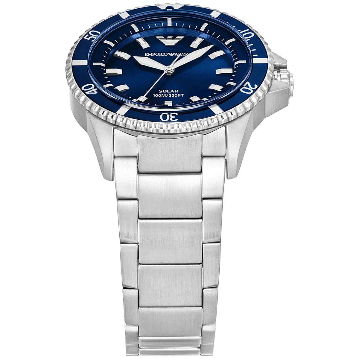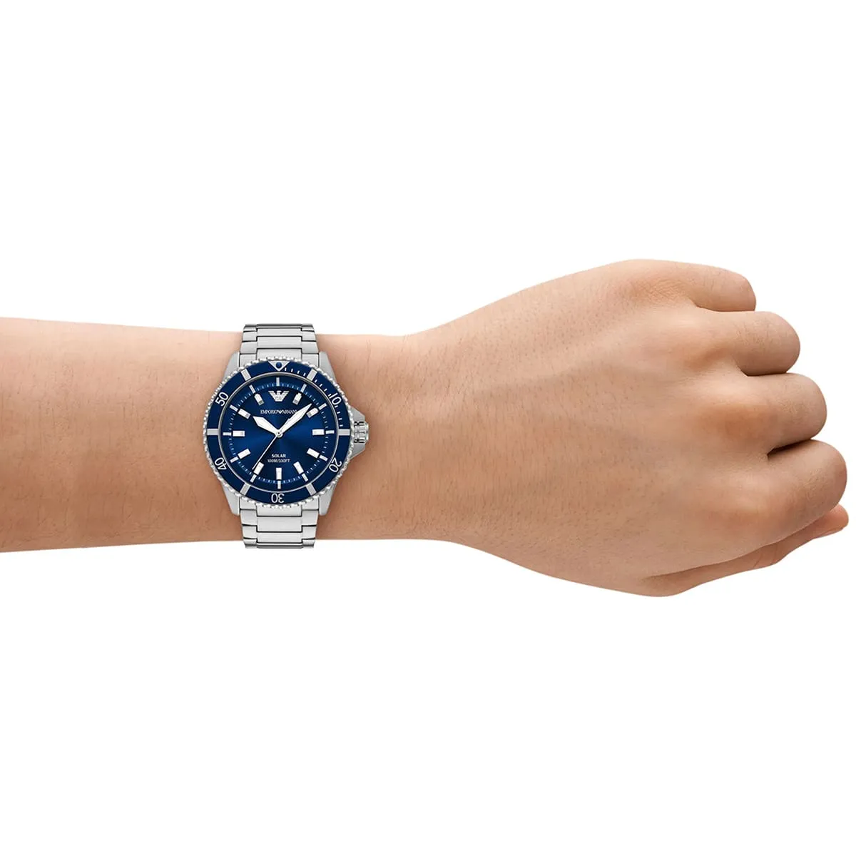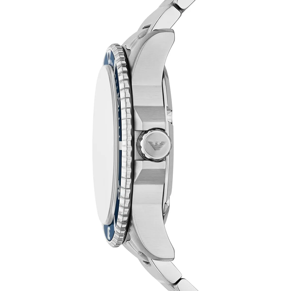 The Emporio Armani Sea Explorer AR60079 is a robust men's automatic diver's watch that fuses Giorgio Armani's Italian sophistication with true underwater performance. Housed in a sturdy 42mm round stainless steel case with a 15mm thickness, its captivating blue dial features luminous hands and indices for exceptional legibility, along with a monthly date window. The silver stainless steel bracelet with 22mm width provides a premium, secure fit at 191 grams. Powered by reliable automatic movement, it offers smooth sweeping seconds and impressive 200 meters water resistance. Designed with Armani's signature modern elegance, this versatile timepiece seamlessly blends rugged diving functionality with refined style, making it the ideal companion for the adventurous man who demands durability, precision, and bold sophistication both on land and in the sea.