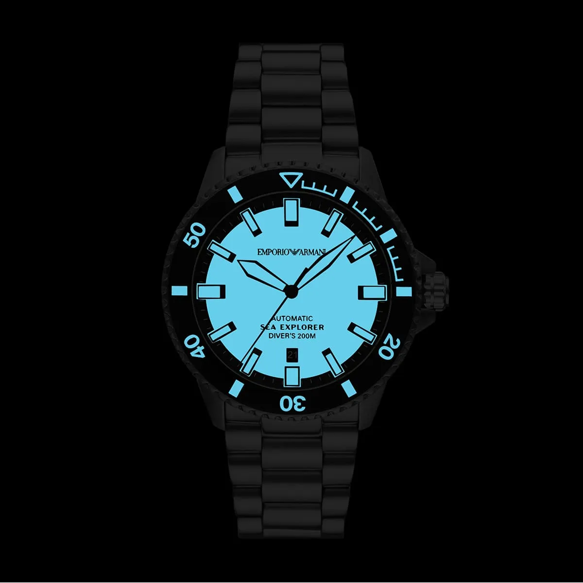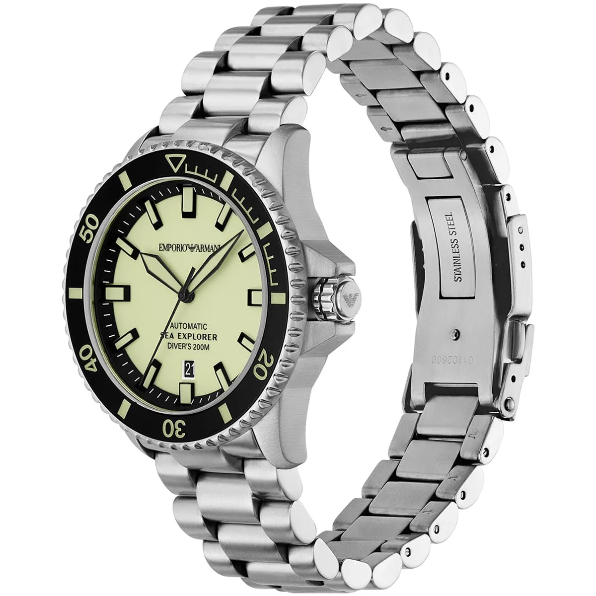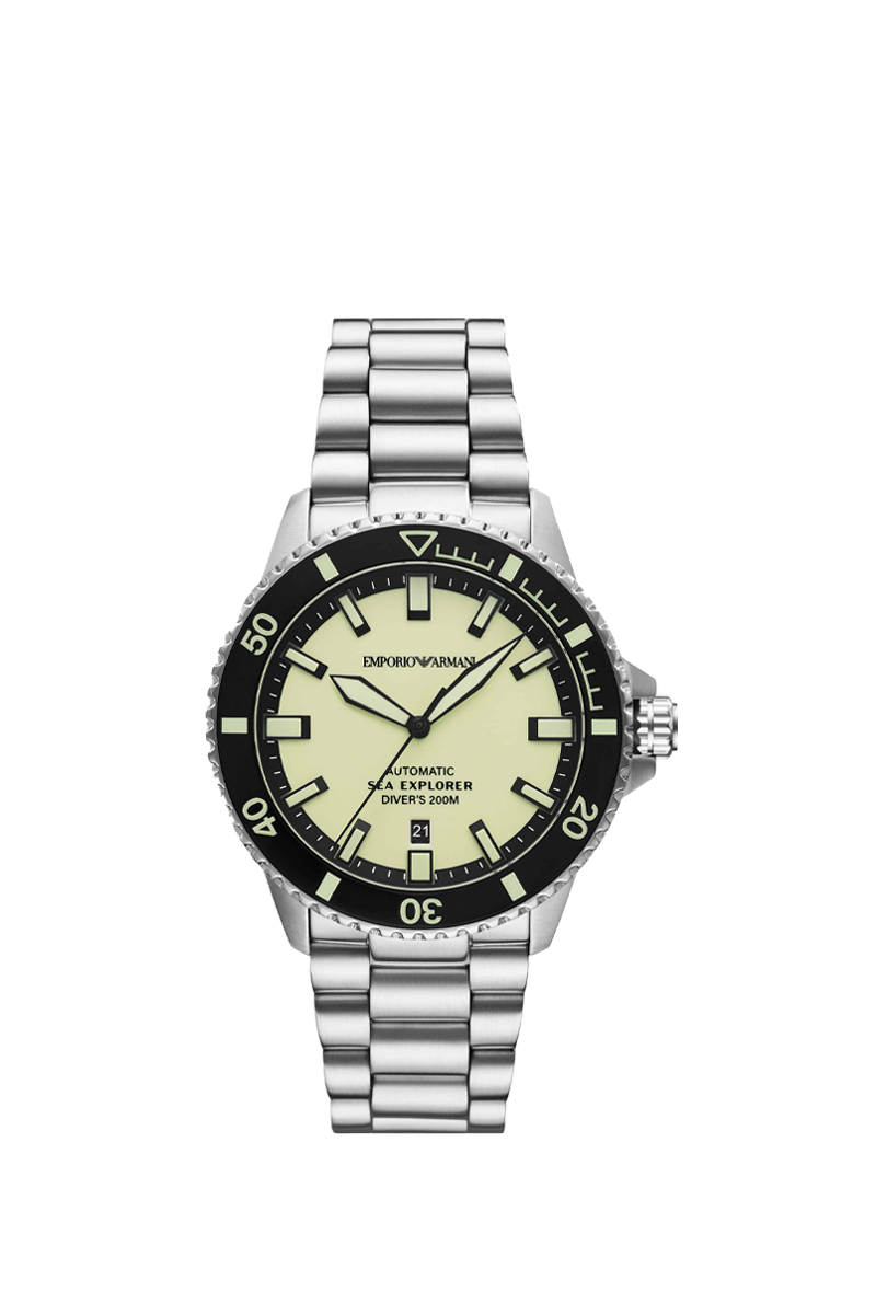 The Emporio Armani Sea Explorer AR60083 is a striking men's automatic diver's watch that merges Giorgio Armani's Italian flair with professional underwater capability. Housed in a robust 42mm round stainless steel case with a 14mm thickness, its vibrant yellow dial features luminous hands and indices for exceptional legibility, along with a monthly date window. The silver stainless steel bracelet with 22mm width offers a premium, secure fit at 120 grams. Powered by reliable automatic movement, it delivers smooth sweeping seconds and impressive 200 meters water resistance. Designed with Armani's signature modern sophistication, this versatile timepiece seamlessly blends rugged diving functionality with bold style, making it the ideal companion for the adventurous man who demands durability, precision, and eye-catching elegance both on land and in the sea.