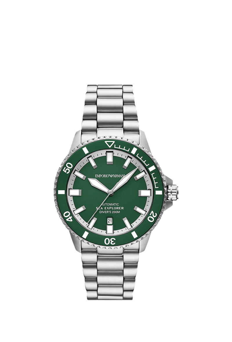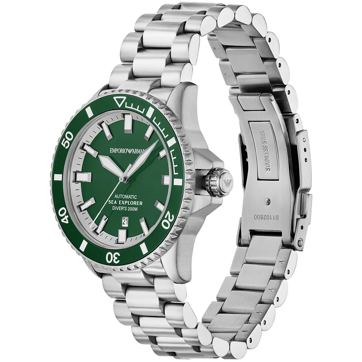 The Emporio Armani Sea Explorer AR60088 is a bold men's automatic diver's watch that fuses Giorgio Armani's Italian sophistication with professional underwater capability. Housed in a robust 42mm round stainless steel case with a 14mm thickness, its vibrant green dial features luminous hands and indices for exceptional legibility, along with a monthly date window. The silver stainless steel bracelet with 22mm width offers a premium, secure fit at 120 grams. Powered by reliable automatic movement, it delivers smooth sweeping seconds and impressive 200 meters water resistance. Designed with Armani's signature modern elegance, this versatile timepiece seamlessly blends rugged diving functionality with refined style, making it the ideal companion for the adventurous man who demands durability, precision, and eye-catching sophistication both on land and in the sea.