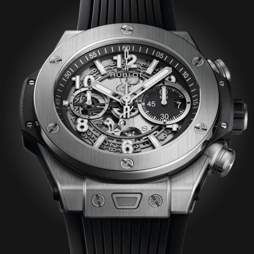 The Big Bang Unico Titanium is powered by a high-precision Quartz movement. This timepiece features the iconic UNICO architecture, highlighted by a skeleton dial showcasing key internal components. The 44mm case and bezel are meticulously crafted from Grade 5 titanium, chosen for its superior lightness, exceptional strength-to-weight ratio, and hypoallergenic properties. This high-quality titanium is polished to reveal a subtle bluish metallic sheen. Finished with a black structured rubber strap and a titanium deployant buckle clasp, this timepiece perfectly merges robust engineering with Hublot's distinctive, modern aesthetic.