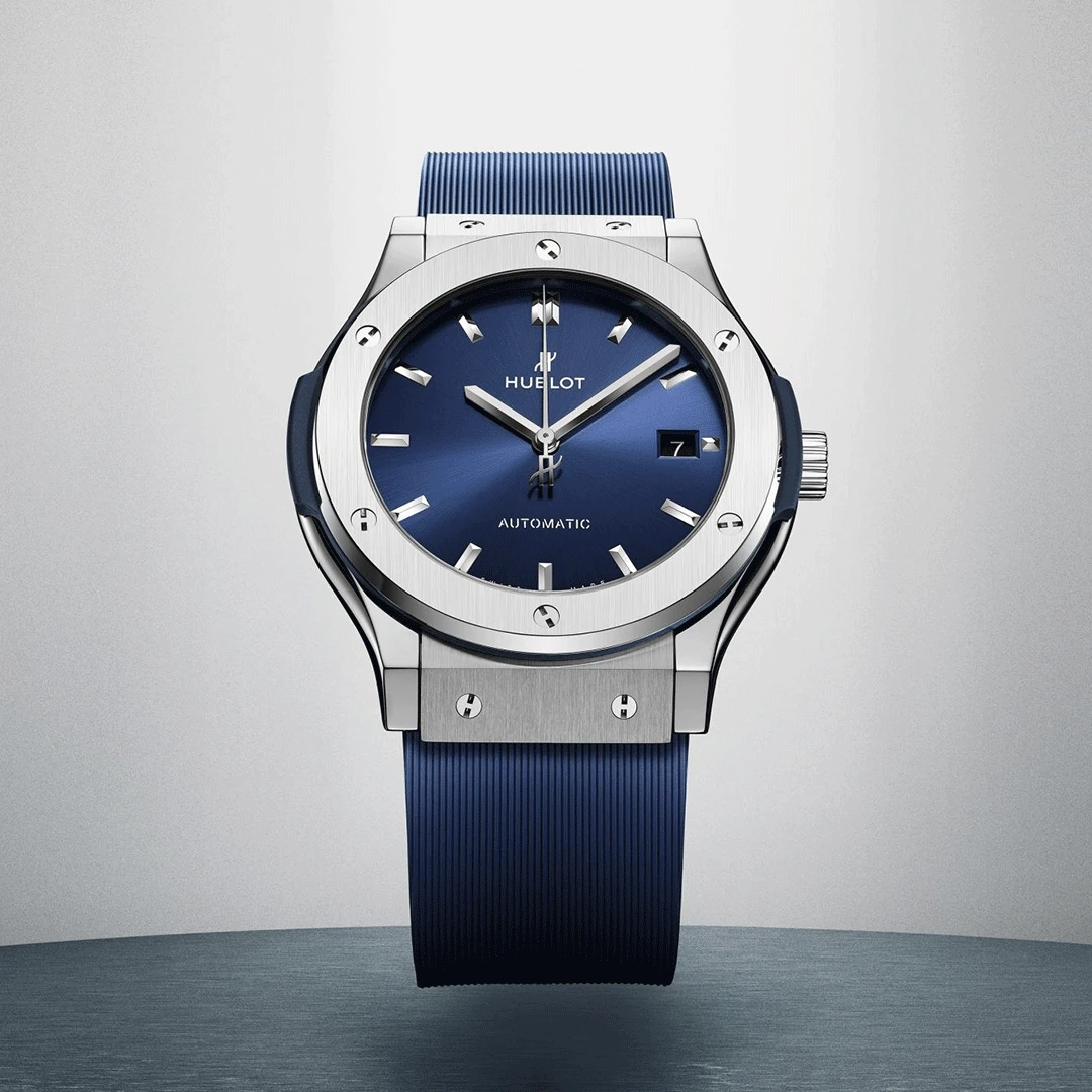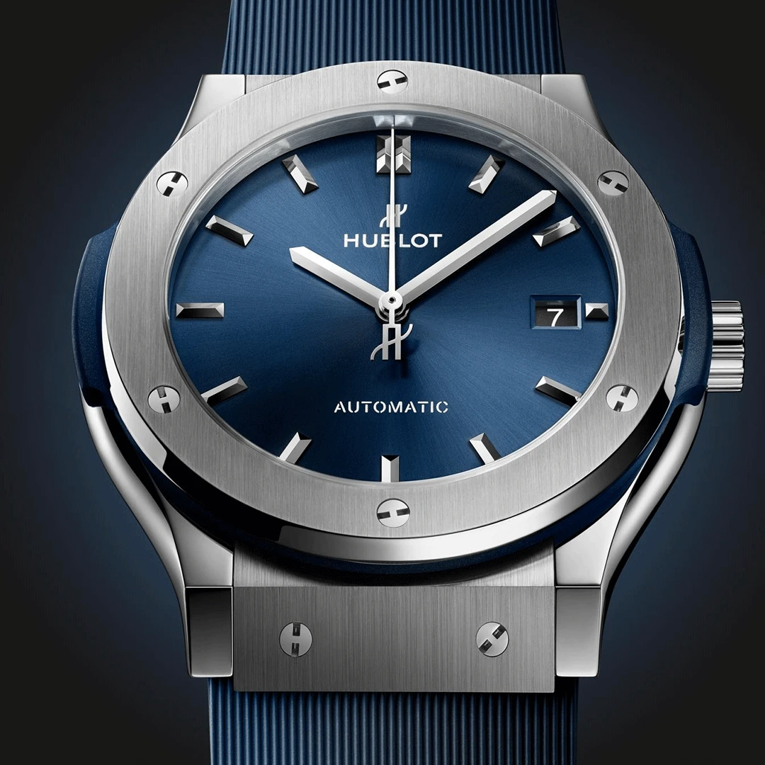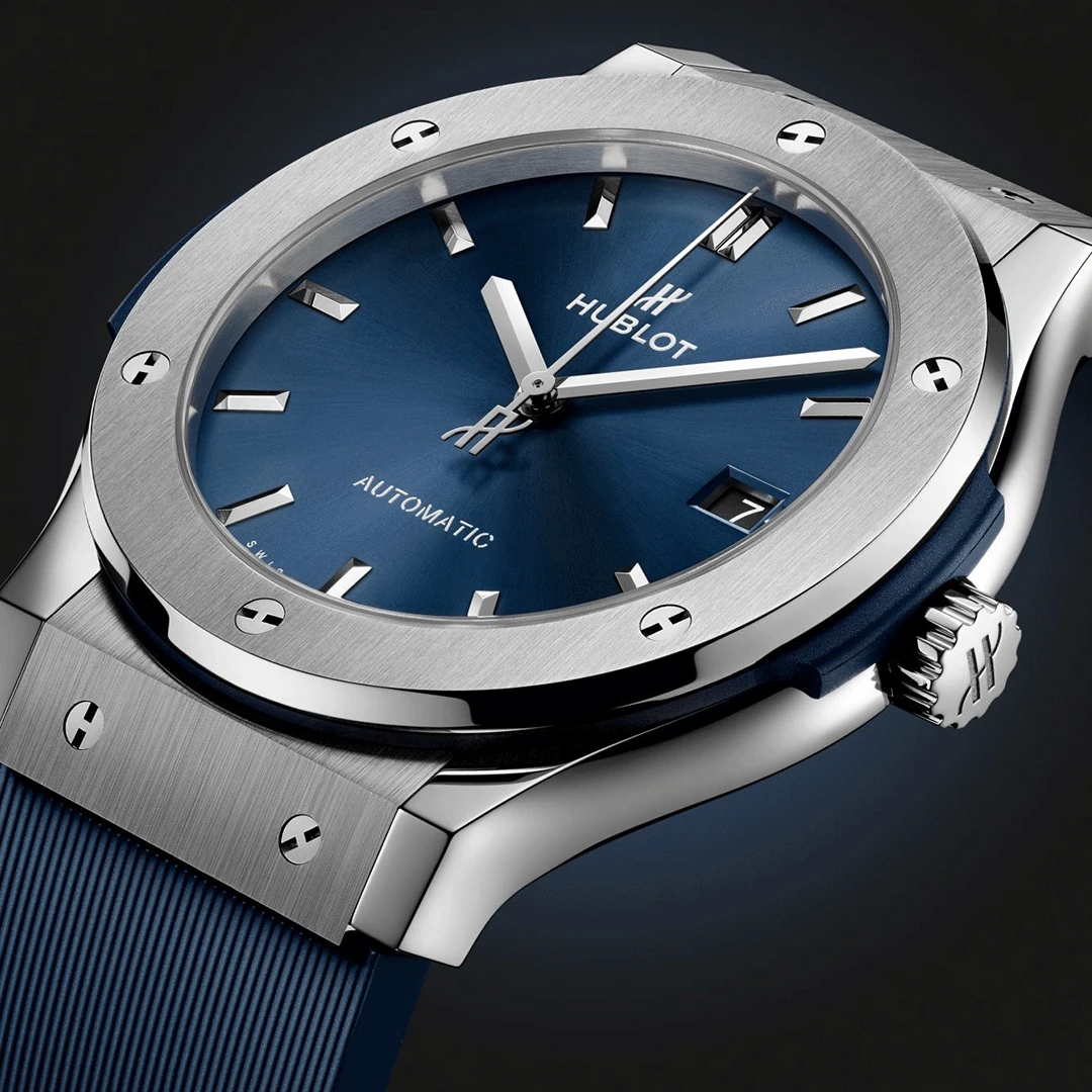 The Hublot Classic Fusion Titanium Blue 45mm 511.NX.7170.RX embodies elegance through innovation. Its satin-finished and polished grade 5 titanium case houses a striking blue sunray dial beneath a sapphire crystal with anti-reflective coating. Powered by a self-winding movement and paired with a blue lined rubber strap, it perfectly expresses Hublot’s signature “Art of Fusion” between modernity and craftsmanship.