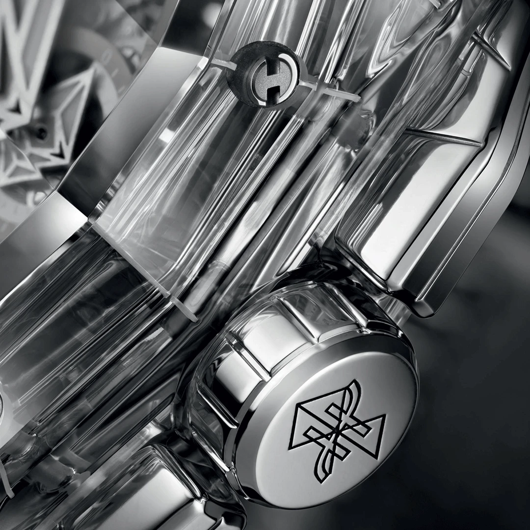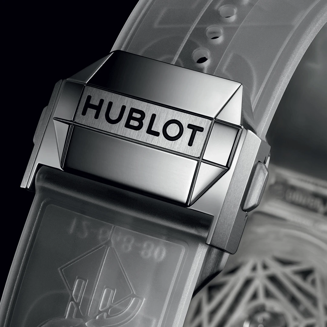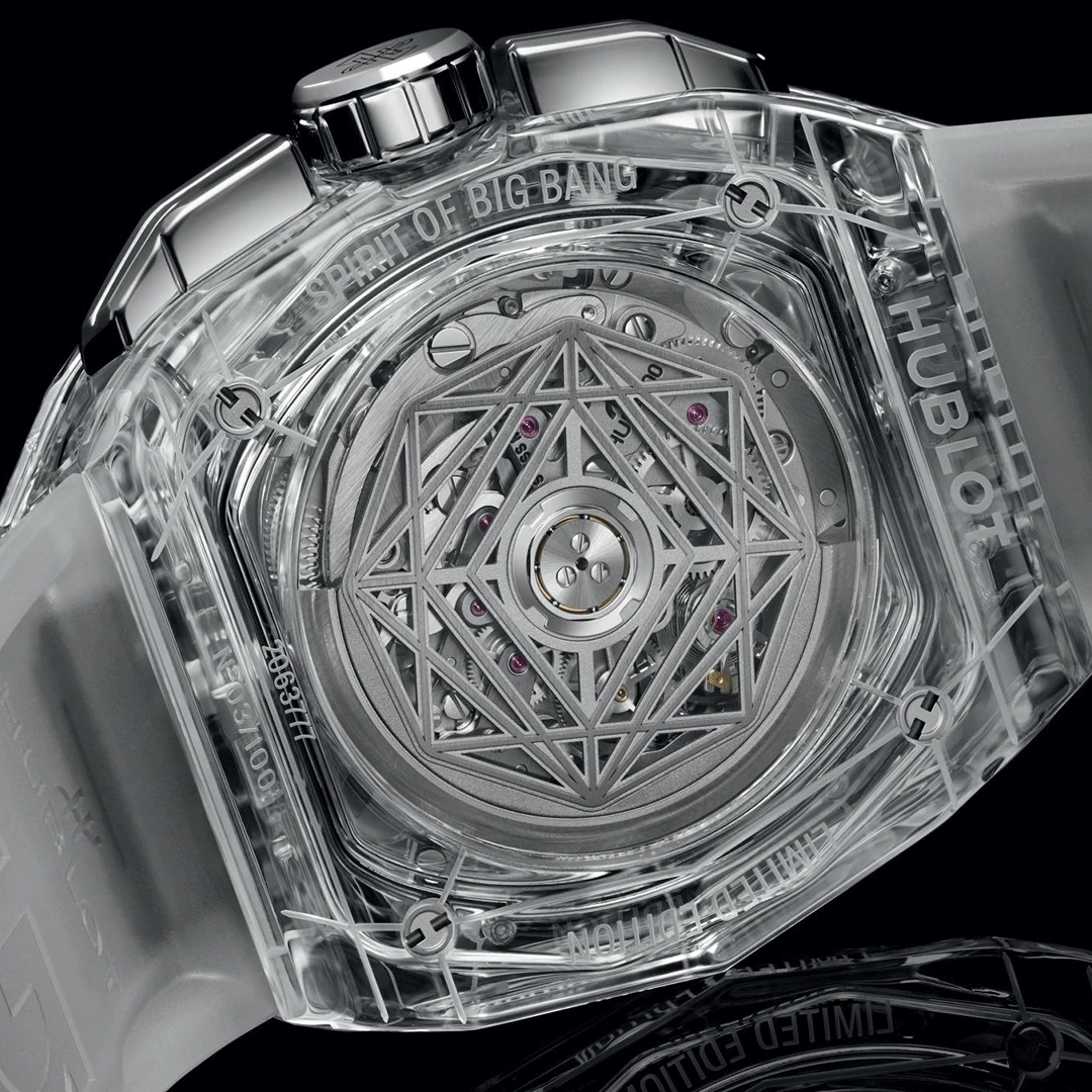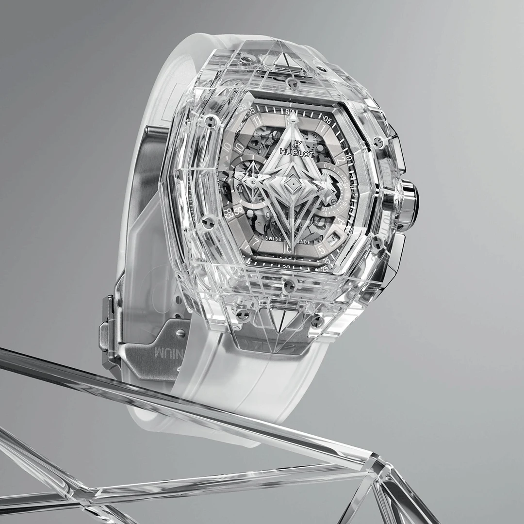 The Hublot Spirit of Big Bang Sang Bleu Sapphire 42mm 648.JX.0102.RT.MXM24 embodies a fusion of art and engineering. Its case and bezel, fully crafted from polished sapphire crystal, reveal the self-winding skeleton chronograph movement within. Complemented by a white structured rubber strap and titanium deployant clasp, this avant-garde masterpiece showcases transparency, precision, and bold modernity in perfect harmony.