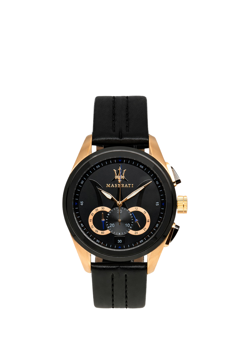 The Maserati Traguardo R8871612025 is a bold men's chronograph that captures the Italian brand's racing spirit and luxurious design. Housed in a substantial 45mm round stainless steel case with a 12.4mm thickness, its intense black dial features luminous hands and indices for superior legibility, complemented by chronograph subdials and stopwatch functionality. The genuine black leather strap with 22mm width offers premium comfort at 104 grams. Powered by reliable quartz movement, it delivers precise performance and impressive 100 meters water resistance. Designed with Maserati's signature dynamic aesthetic, this versatile timepiece seamlessly blends sporty chronograph utility with sophisticated style, making it an ideal choice for the confident man who appreciates automotive-inspired elegance, durability, and standout presence in everyday wear.