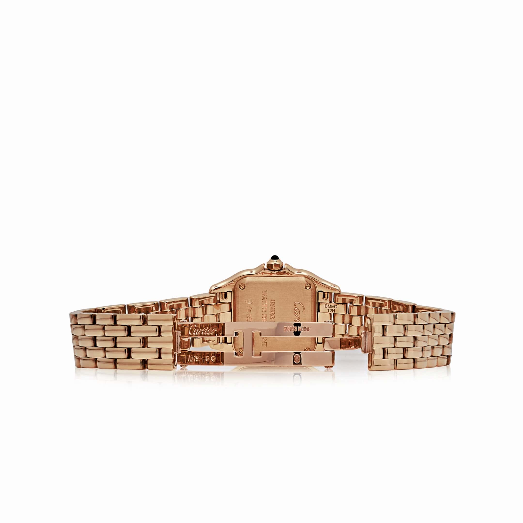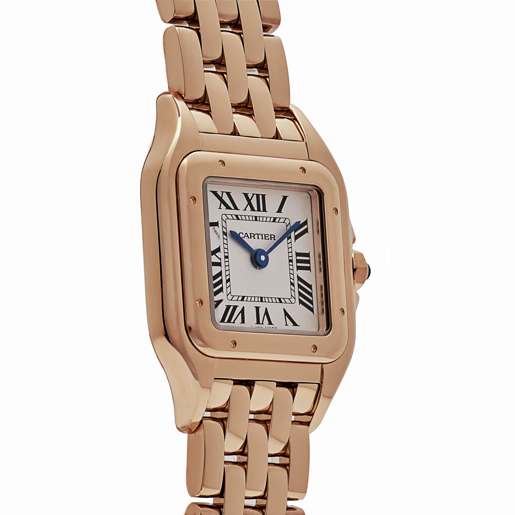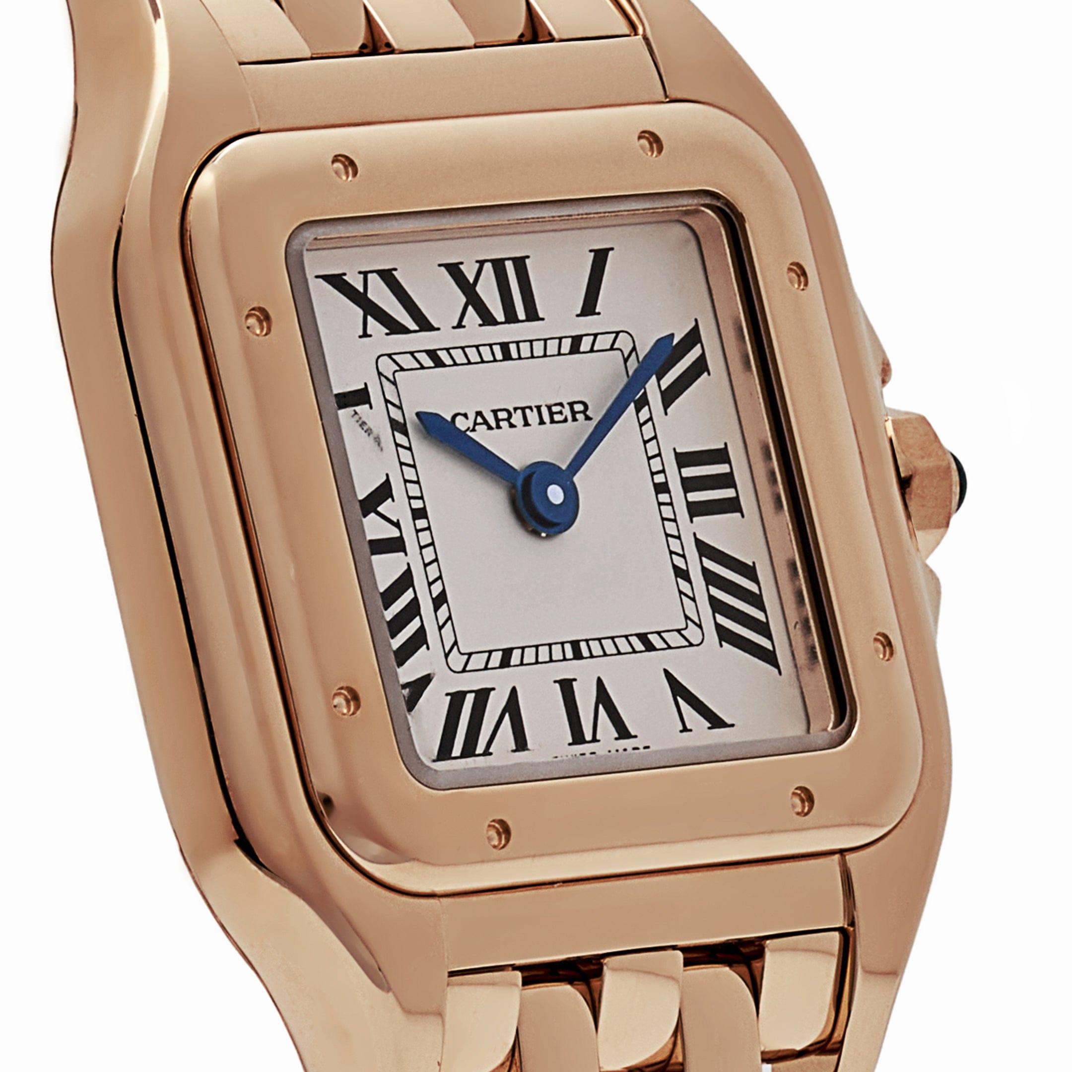 The Panthère de Cartier Small in rose gold color embodies timeless elegance and feminine grace. Its refined design features a white dial with Roman numerals, framed by the iconic rounded case and fluid link bracelet. Powered by a precise quartz movement, this watch blends classic charm and modern luxury—an exquisite symbol of sophistication and style.