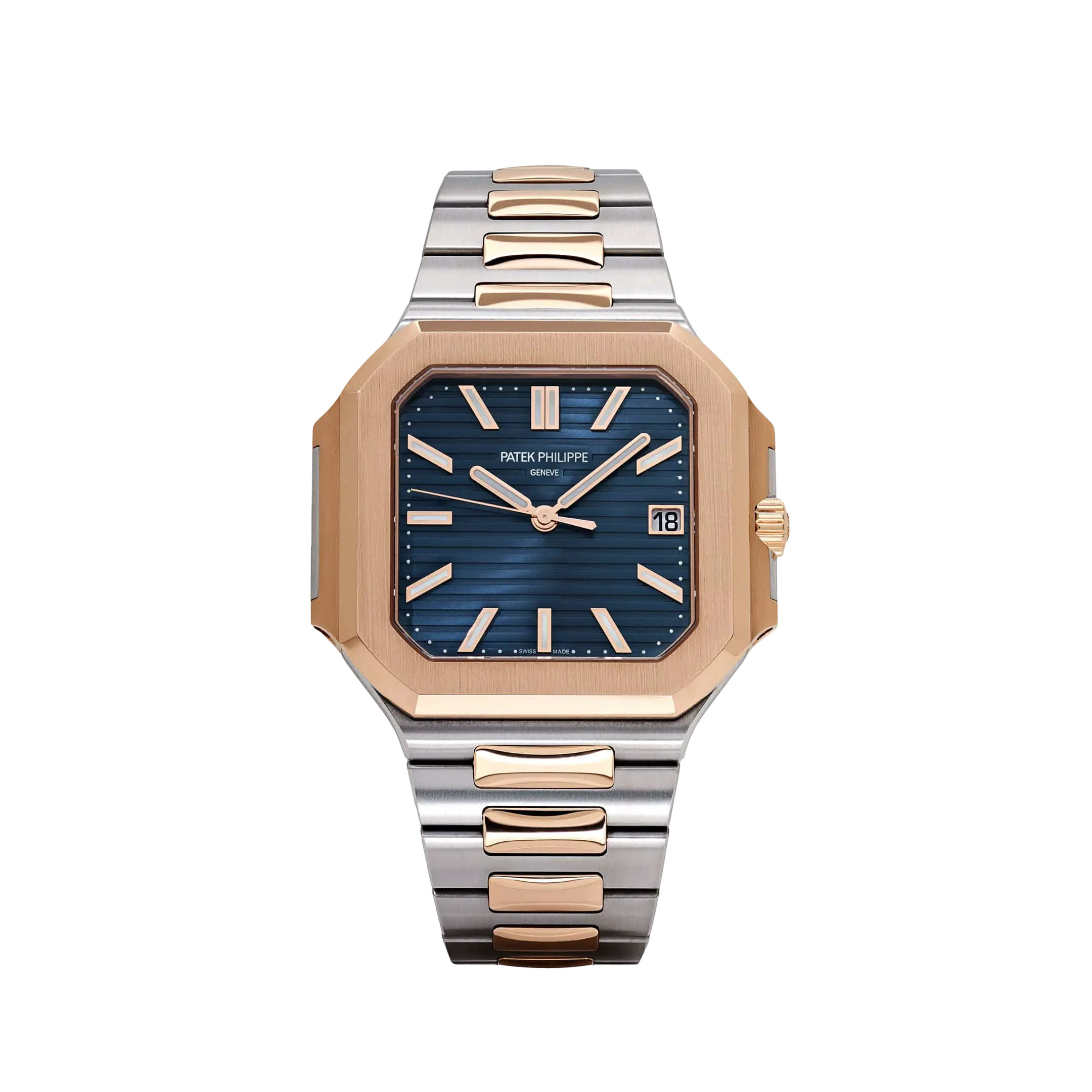 The Patek Philippe Cubitus 5821/1AR-001 redefines modern elegance with its two-tone construction of stainless steel and rose gold. The unique cuboidal case and integrated bracelet create a seamless and contemporary silhouette, setting this model apart from traditional round designs.